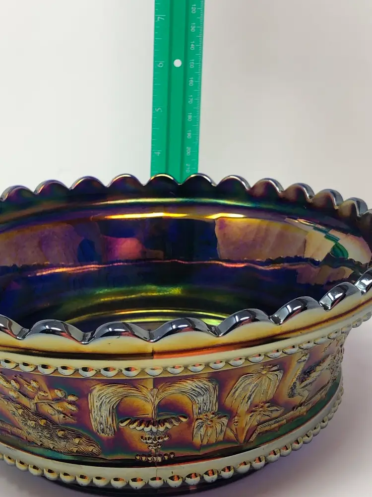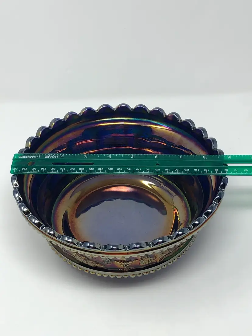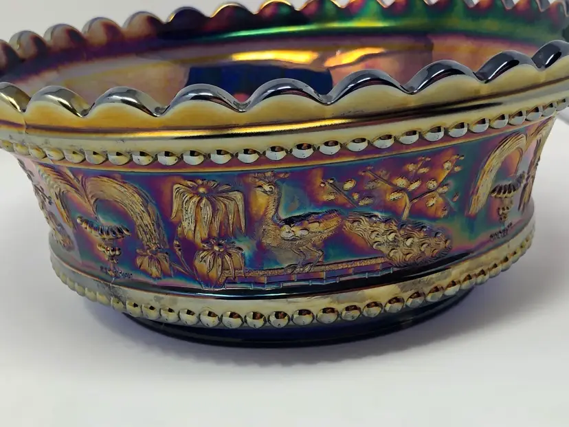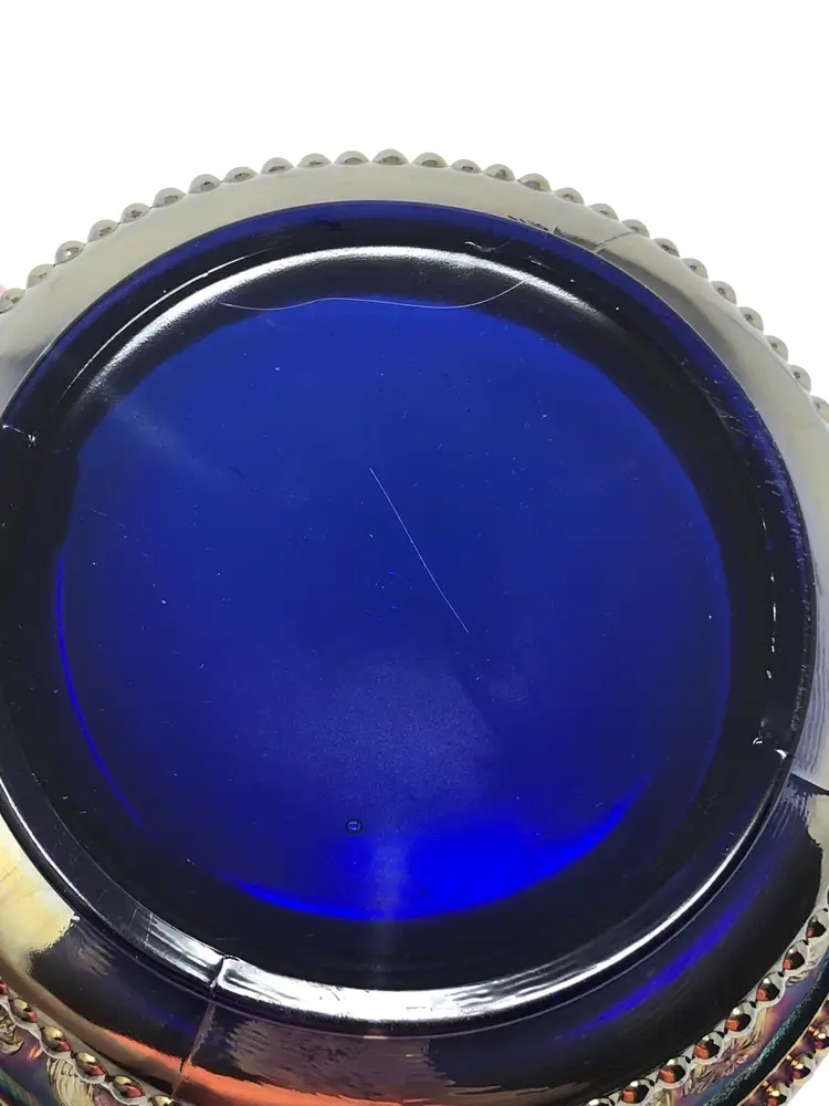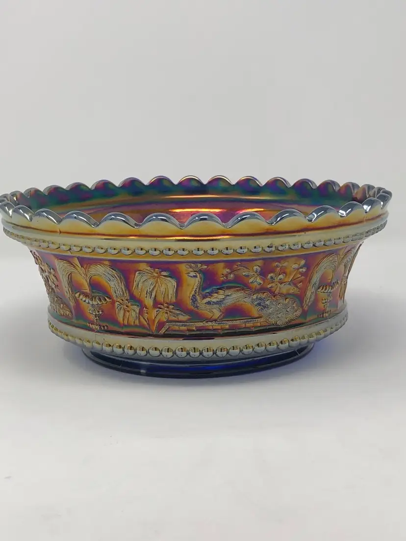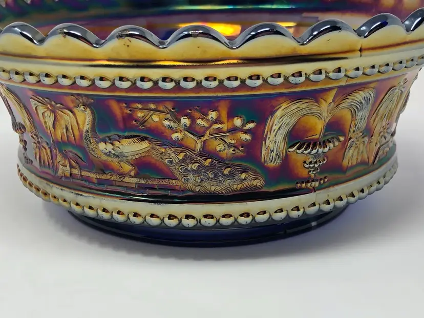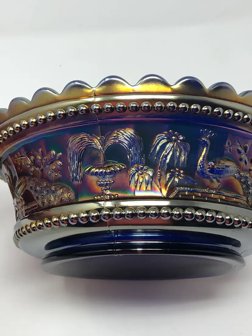So magnificent! This amazing piece of carnival glass is a fantastic find! The base glass is cobalt blue and the iridescence is brilliant. The design features intricate peacocks and fountains and is a favorite of collectors. Marked with the Northwood N and in beautiful vintage condition, as shown in photos.