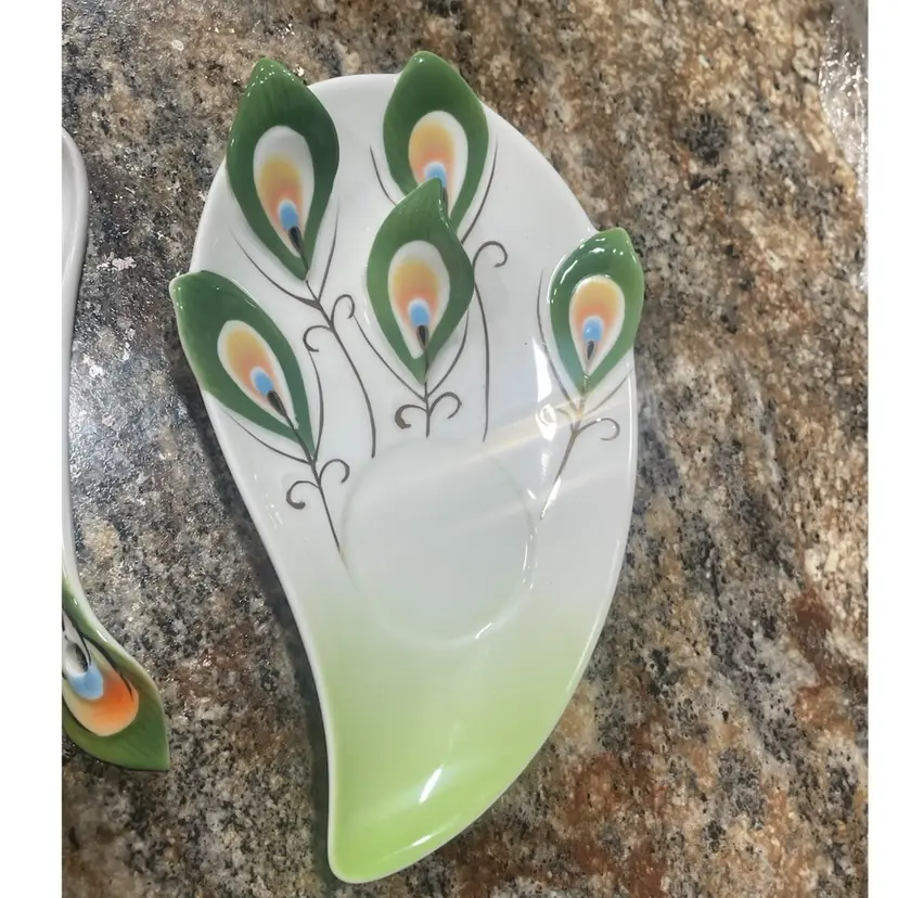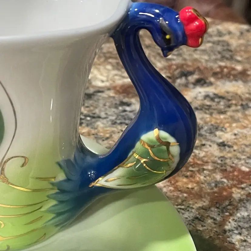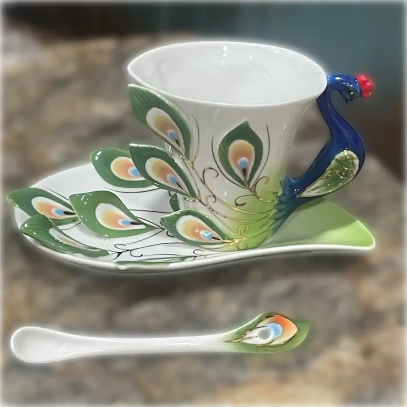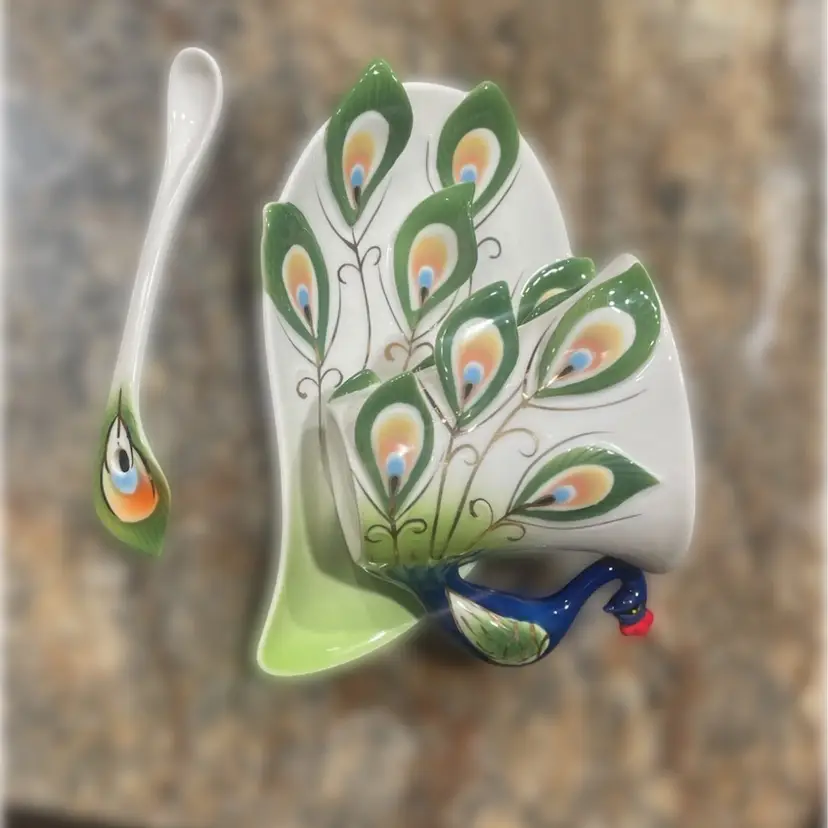 Elegant tea cup set featuring a 3D peacock design. Includes matching spoon and saucer. Vibrant colors add a touch of luxury.