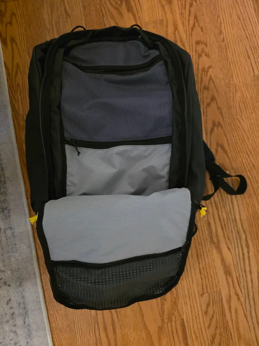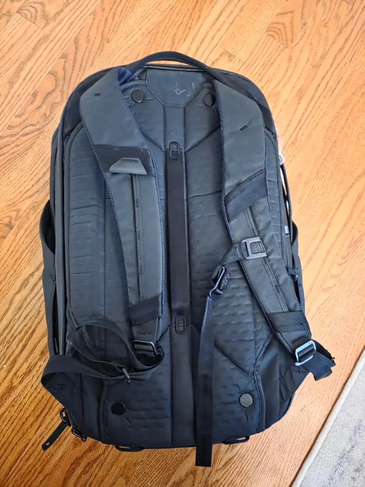 35L expandable to 45L. Used it off and on for a few years but now have transitioned to a smaller bag for travel. Good condition with a bit of normal wear but no serious scuffs or scratches.
