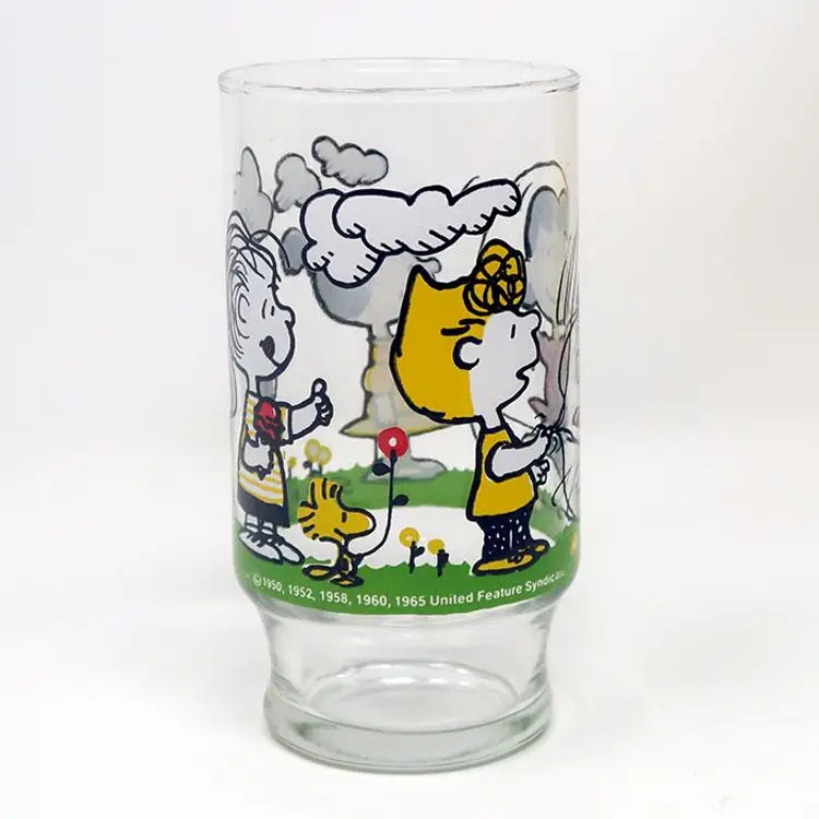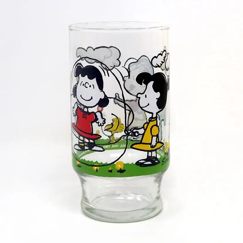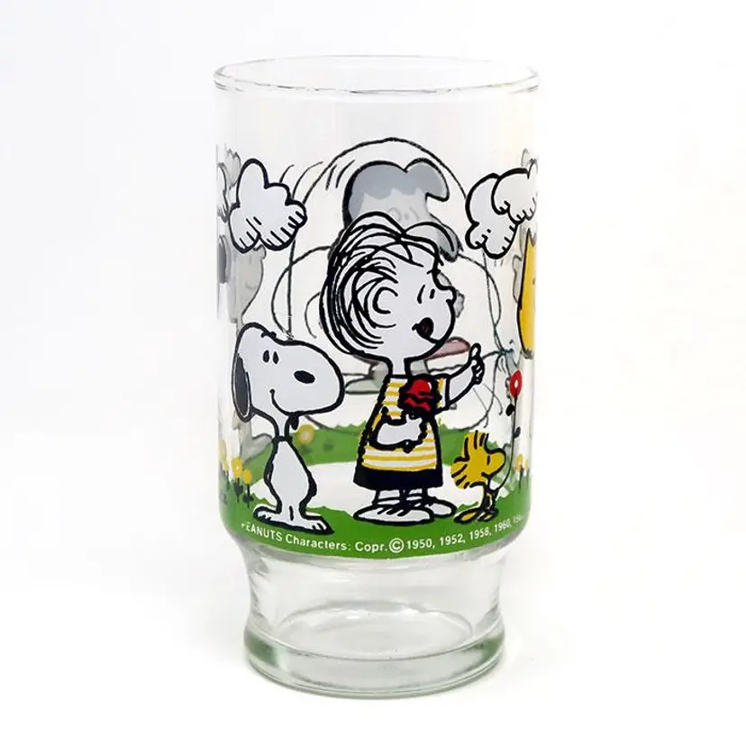 Enjoy your favorite drink with this vintage Peanuts Gang Glass Tumbler. Featuring Snoopy, Linus, Lucy, Sally, Violet and Woodstock in a playful outdoor scene, it's a nostalgic addition to any Peanuts collection. Perfect for fans of all ages! Made by Anchor Hocking.