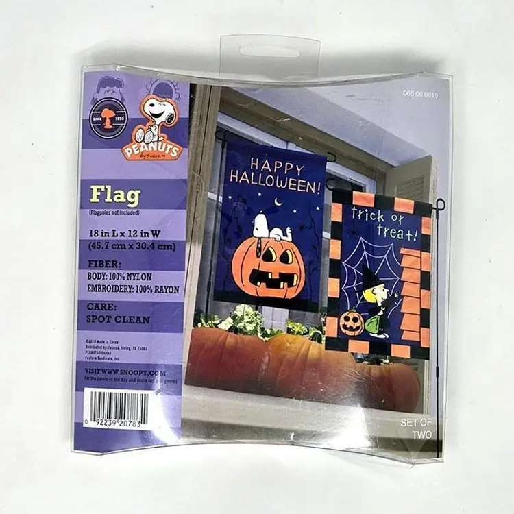 Decorate your garden with this set of two Peanuts Halloween flags. Featuring Snoopy and Sally in festive designs, these flags are perfect for adding a touch of Halloween spirit to your outdoor decor. Made of durable nylon with vibrant embroidery, the flags are 12" x 18". A great addition to any Peanuts fan's Halloween decor collection!
