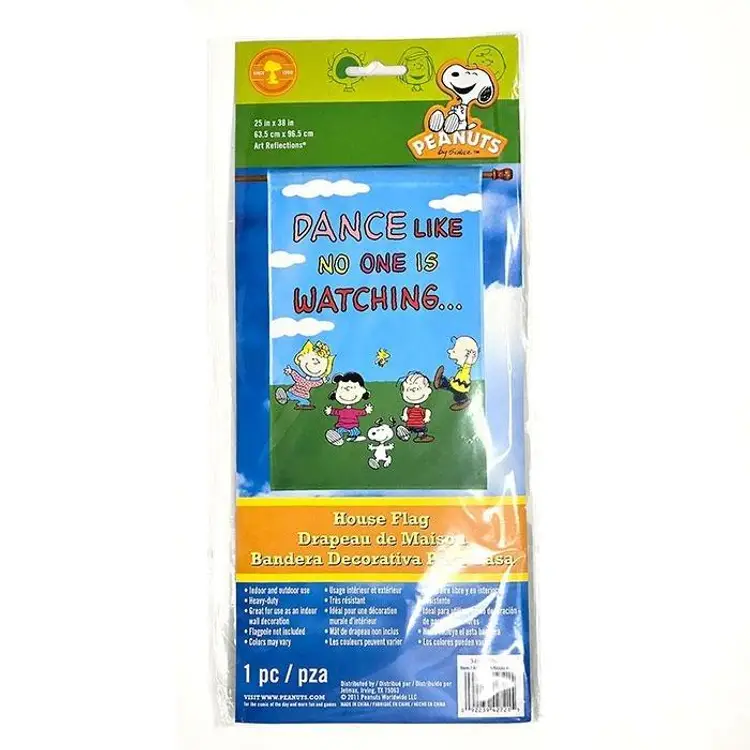 Brighten up your home with this delightful Peanuts House Flag featuring Snoopy, Charlie Brown, and friends dancing joyfully. Perfect for any Peanuts fan, this flag adds a playful touch to your outdoor decor. It's ideal for showcasing your love for the Peanuts gang. Unused in the original package. Size: 25" x 38"