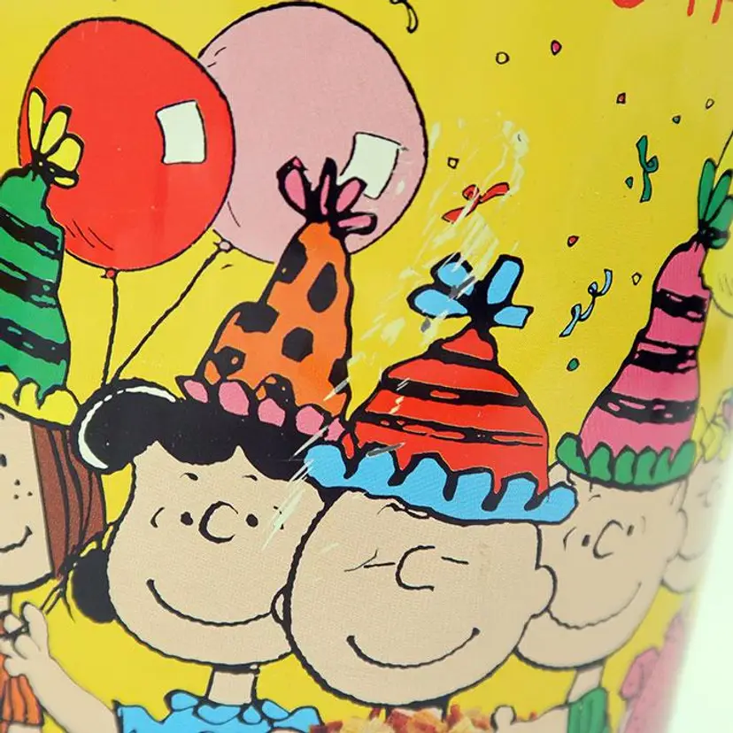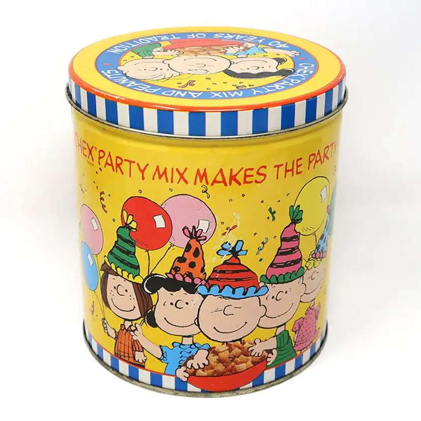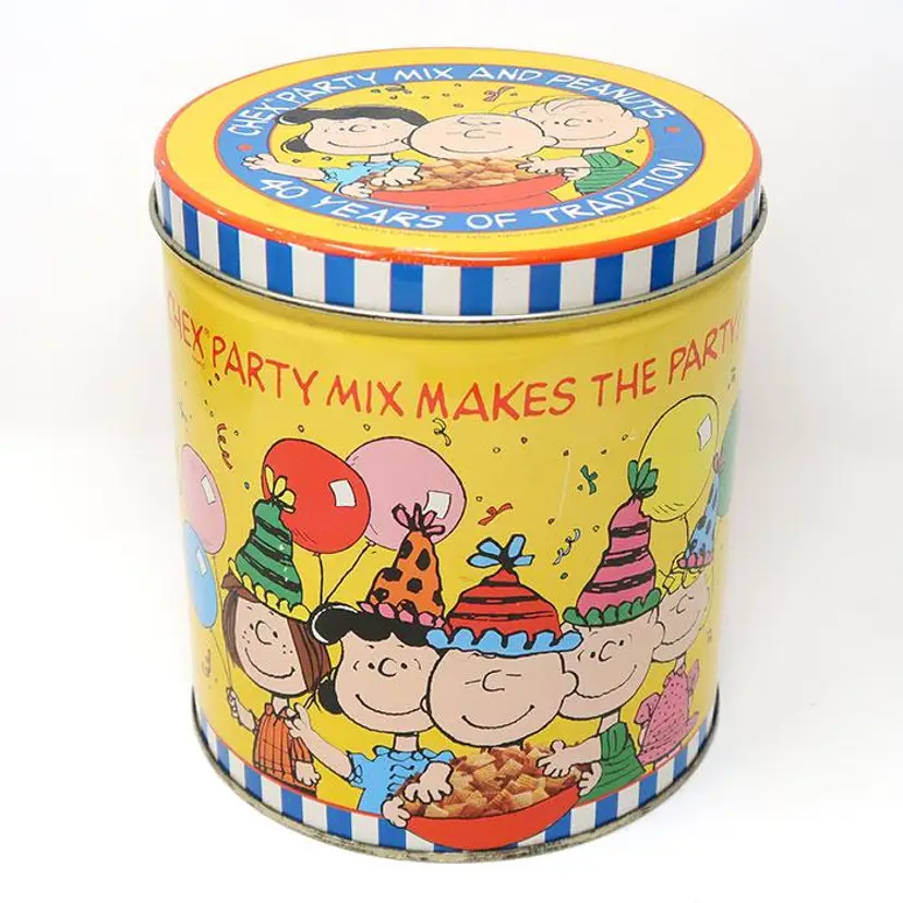 Celebrate 40 years of Peanuts with this colorful Chex Party Mix Tin! Featuring Charlie Brown, Snoopy, and the gang in festive party hats, this collectible tin is perfect for storing snacks or as a charming display piece. The underside of the lid has the delicious Chex Mix Recipe on it. The vibrant design and nostalgic artwork make it a great addition to a Peanuts fan's collection. The tin has some scratches, rust spots inside, and other signs of use - see photos.