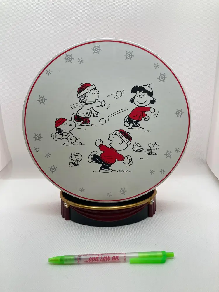 Fun winter scene of the Peanuts gang in the snow. -8" round, 3" tall pre-owned, good condition