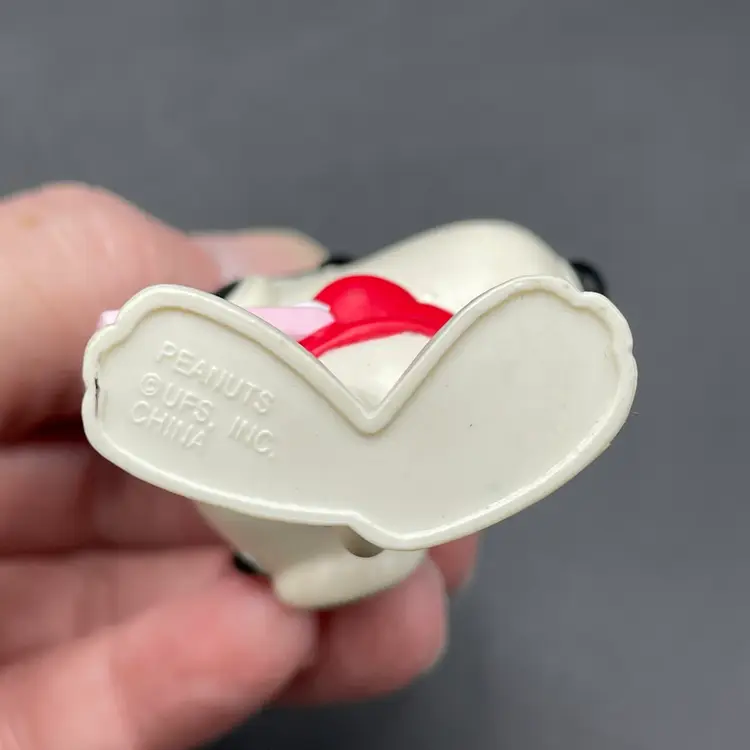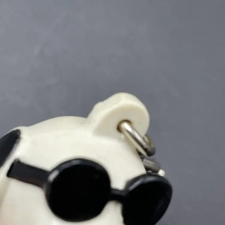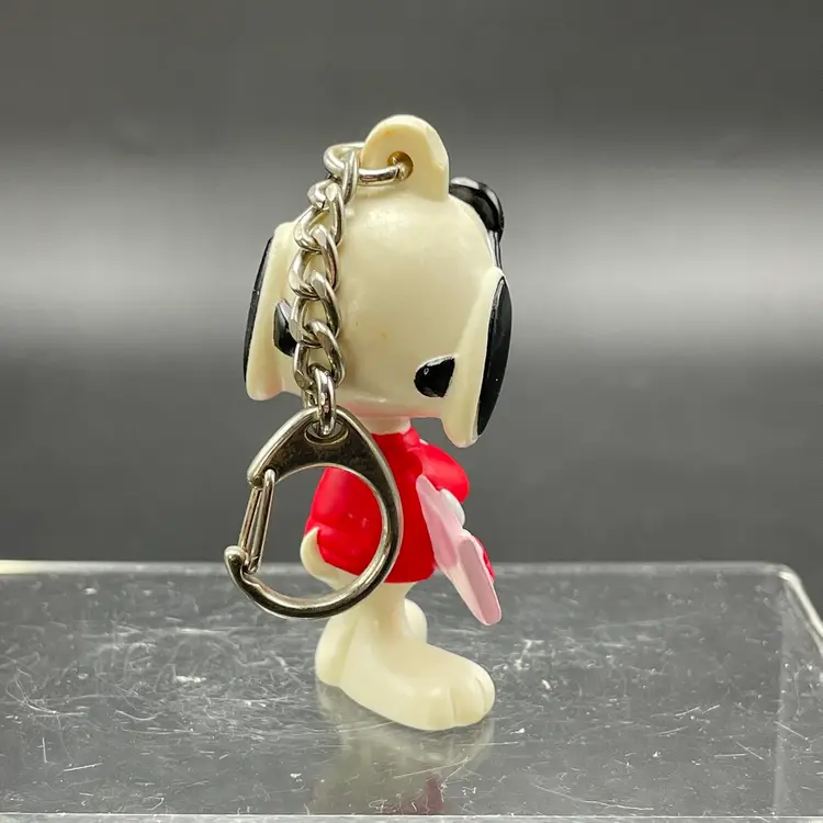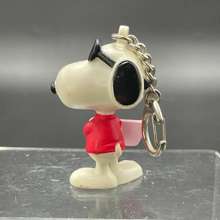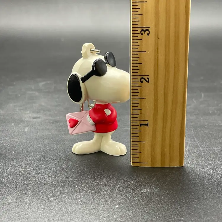This is a vintage Valentine's Day Peanuts Snoopy Joe Cool key chain. Whitman's Candy included these ornaments in their boxes of chocolates starting in the 1990s. Made of PVC. Marked on the bottom. Measures approximately 2.5" tall. There is a divot in the key chain loop as shown in pictures. No other major flaws.