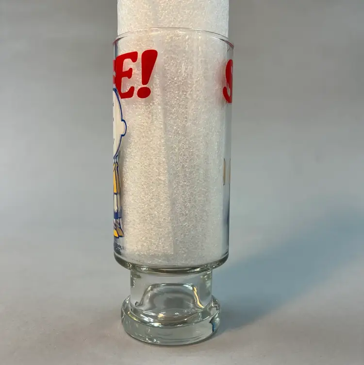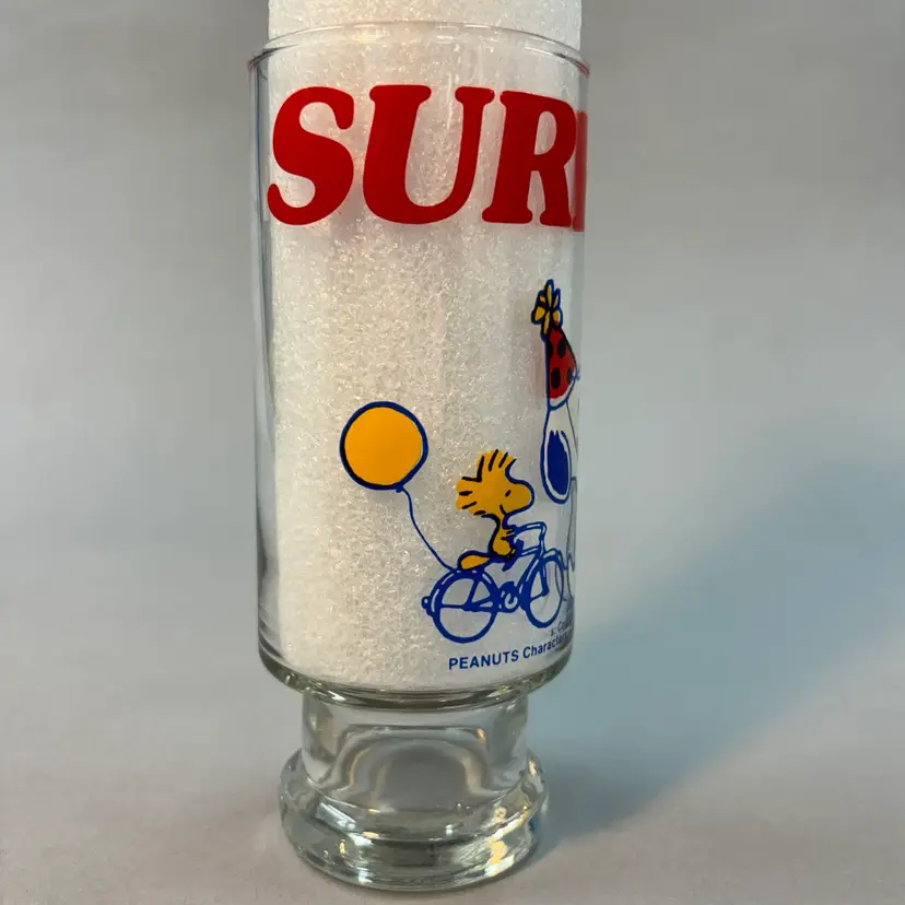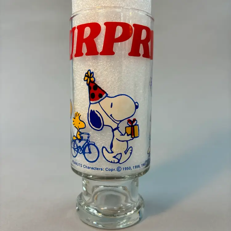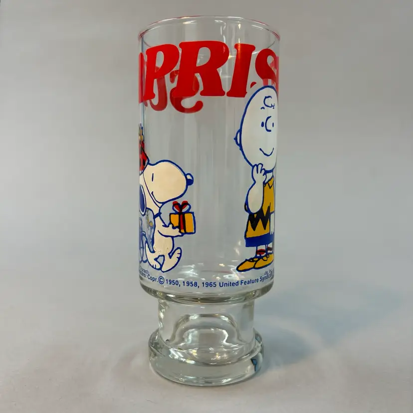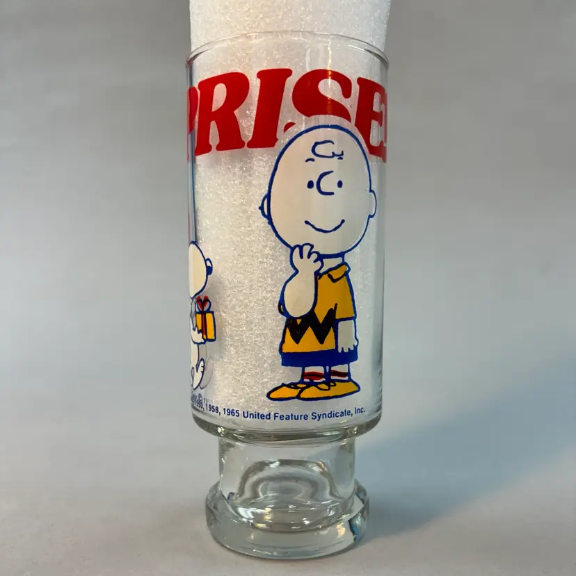 “Surprise” yourself or a friend with this awesome glass! It is in excellent condition. The colors are vibrant with no paint loss. I love that Charlie Brown is the one being surprised with a gift here. He definitely deserves it!