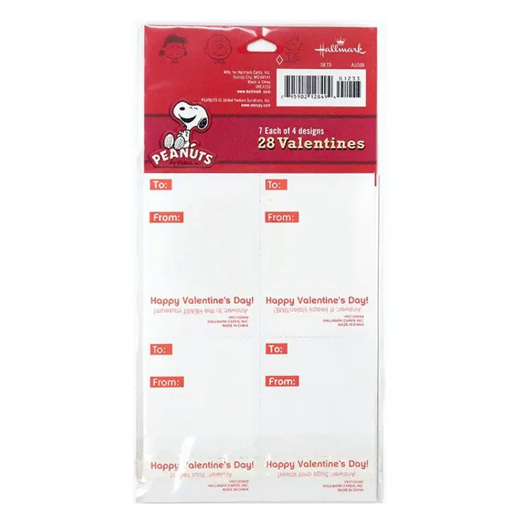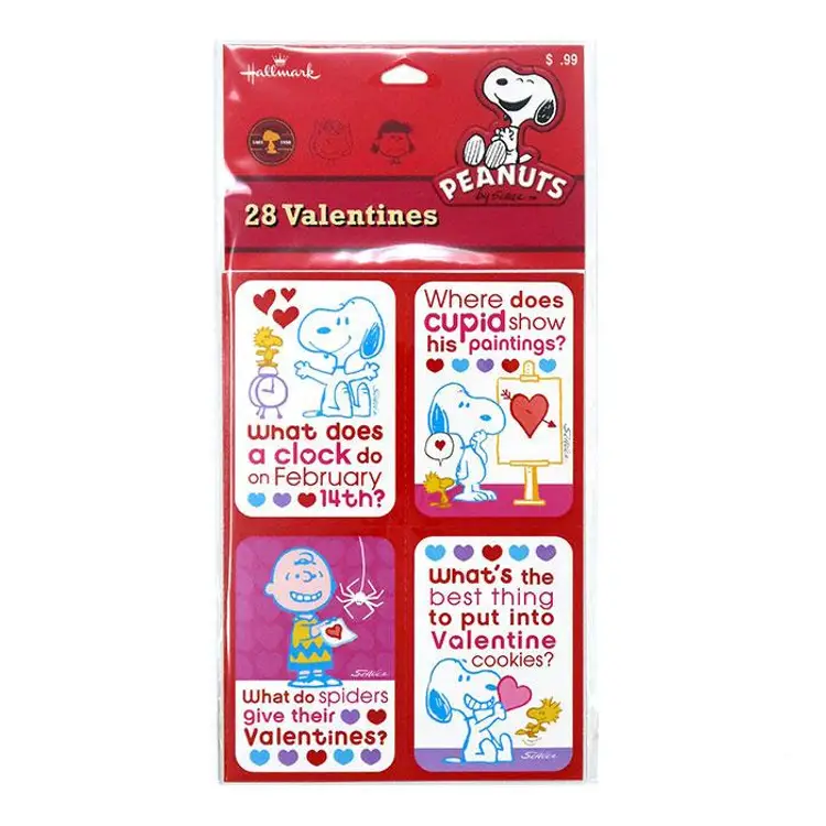 Share the love with this set of 28 Peanuts Valentine's Day cards featuring Snoopy and friends. Each card has a fun, playful design and a cute message, perfect for classroom exchanges or sending to fellow Peanuts fans. Made by Hallmark, these cards are a delightful way to celebrate the holiday with a touch of nostalgia. Mint in the original package.