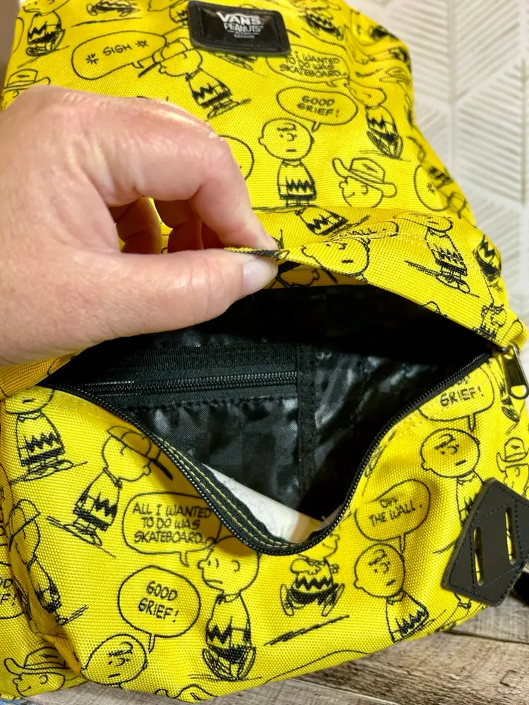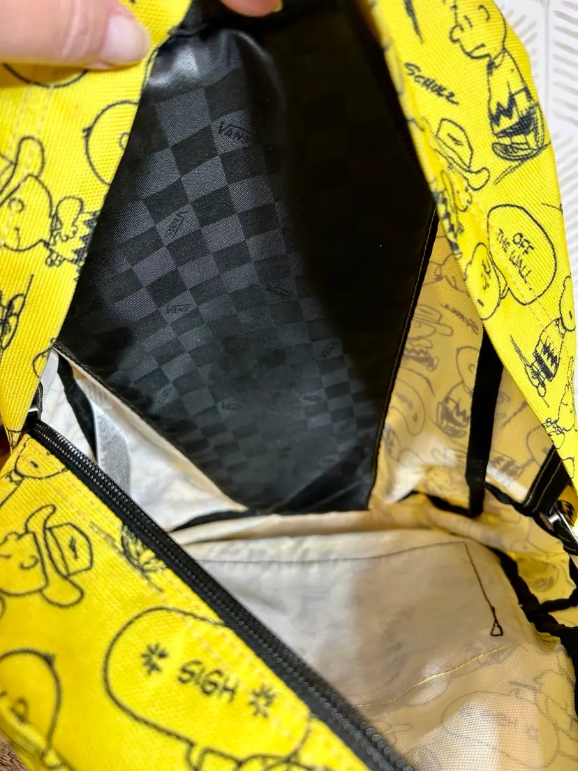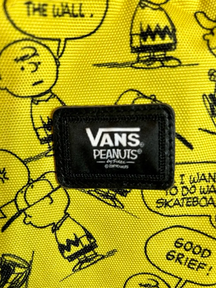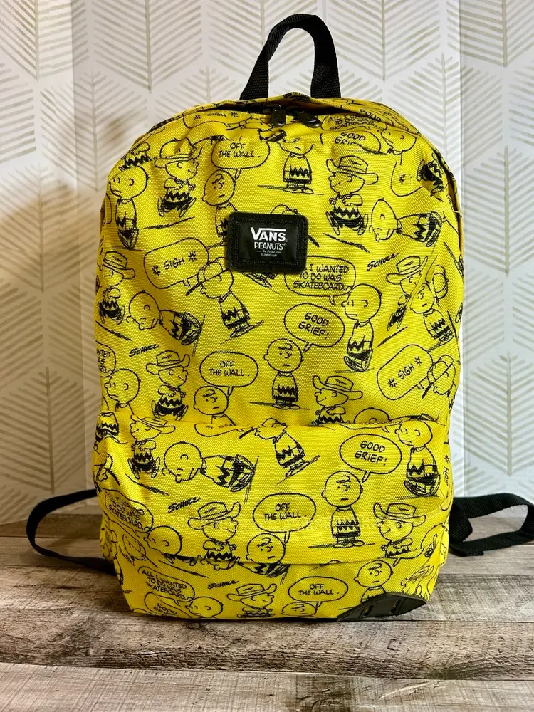 Charlie Brown meets Vans brand in this full size yellow and black backpack. Like new condition. Front zipper pocket has an added zipper pocket and slide in pockets inside. The inside large compartment is big enough for all things school, playtime, and/or sleepover time. Back to school will be here before we know it so, if you have someone that loves Charlie Brown & Vans go ahead and surprise them with this gem!