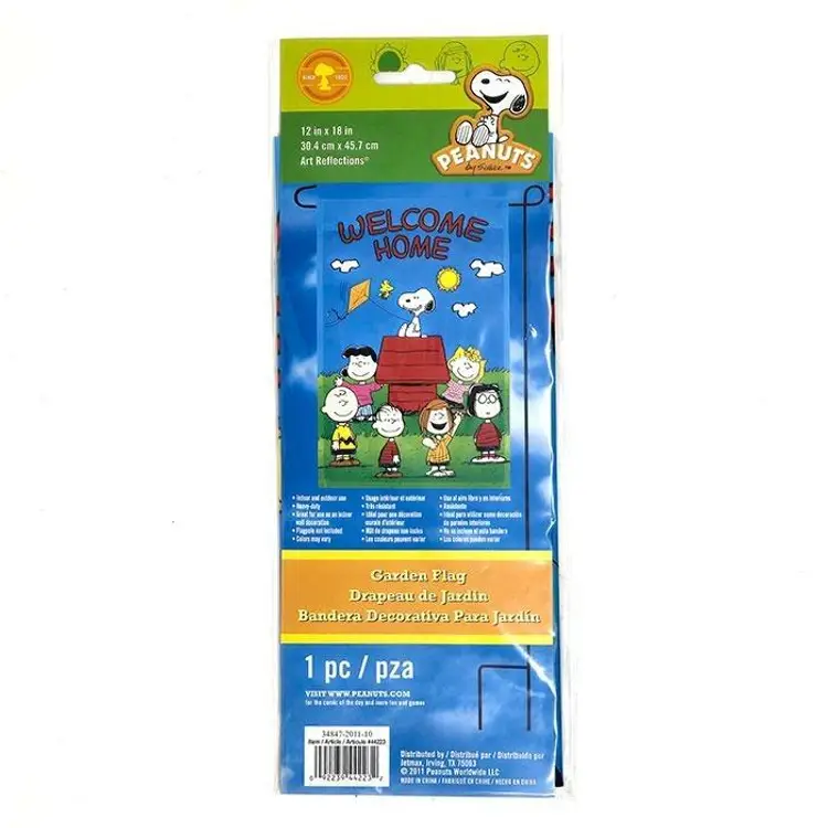Brighten up your garden with this Peanuts Welcome Home Garden Flag. Featuring Snoopy, Charlie Brown, and friends gathered around Snoopy's doghouse, it's a cheerful addition to any outdoor space. Perfect for Peanuts fans who love to showcase their favorite characters. New in package. Size: 12" x 18"