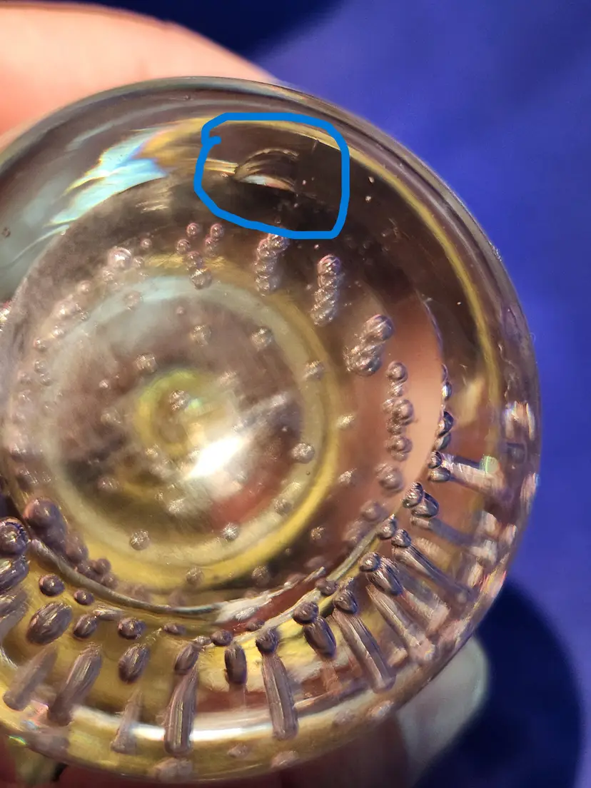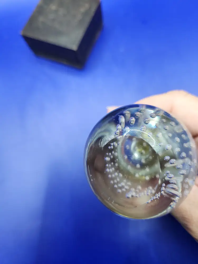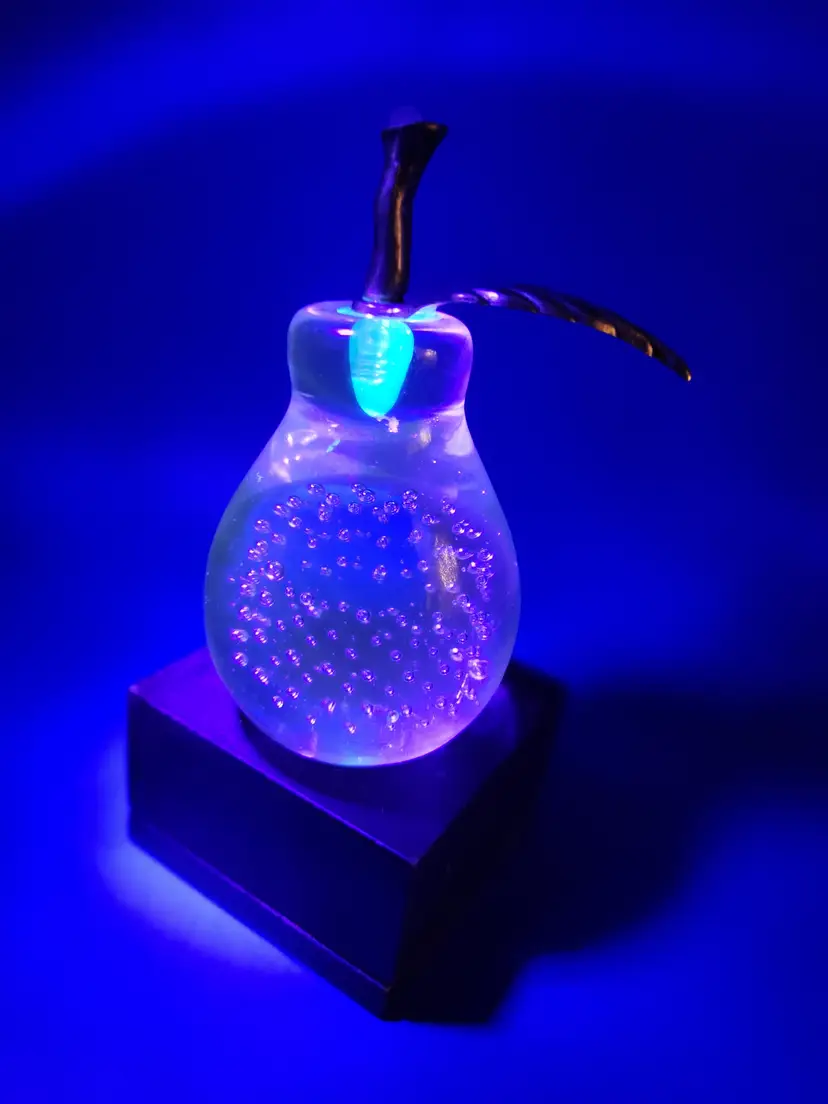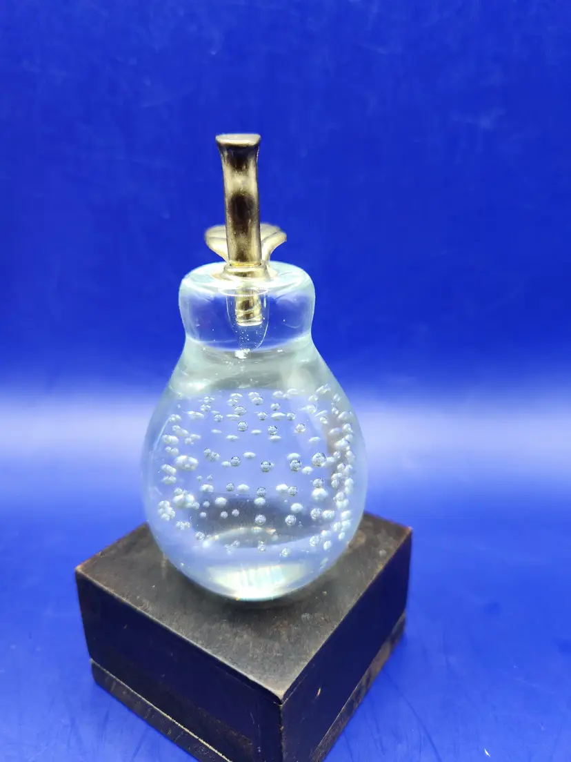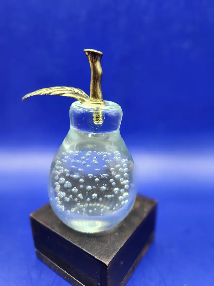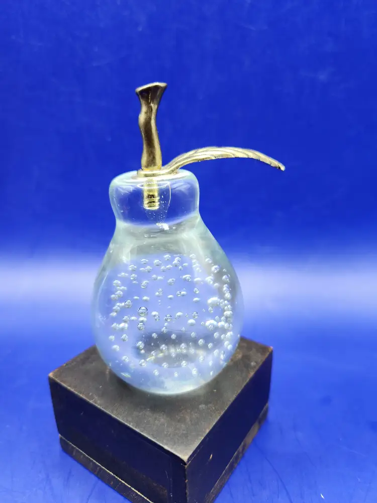 Pear with Metal Stem and Leaf Paperweight Controlled bubbles in main part of pear Measures 4 inches tall and 2 inches at widest Smooth bottom however there are surface marks There is a small chip on the pear near the bottom (see last photo) - it isn't seen readily Under backlight the 'stem' inside the pear glows (see photo) Otherwise great condition