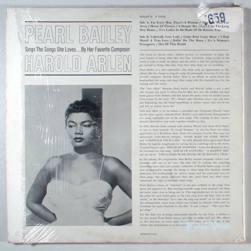 Pearl Bailey Sings the Songs She Loves...By Her Favorite Composer Harold Arlen features songs hand-picked by Bailey. Her love of Arlen goes way back to when she first met the modest one-time band pianist from Buffalo and first heard the music from his famed Cotton Club revues in the early '30s. Arlen, in turn, has openly admired Bailey's style and honest interpretation of a song for years. The crossing of their careers, mutual admiration, and work together led to this wonderful album.