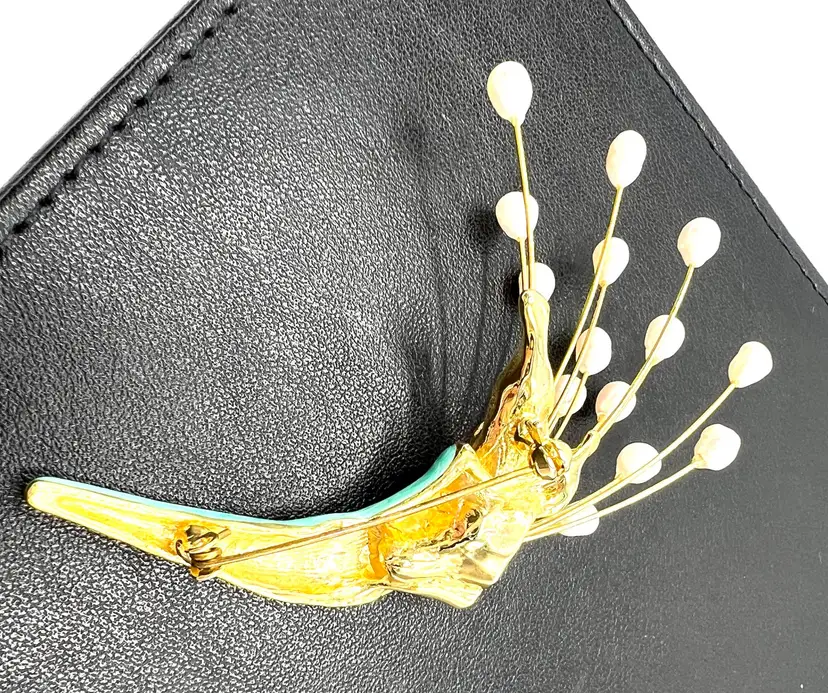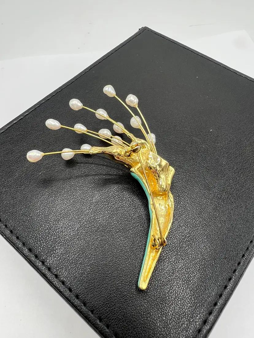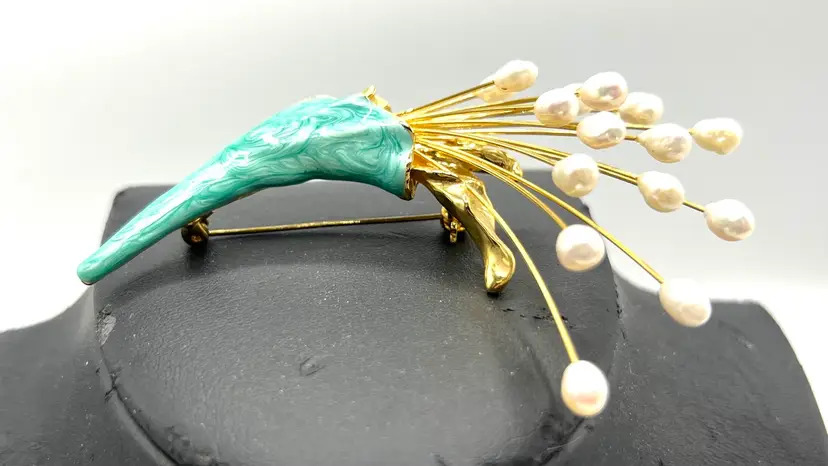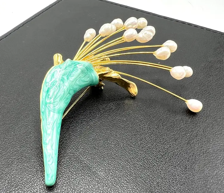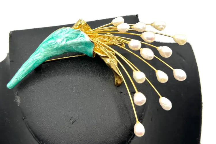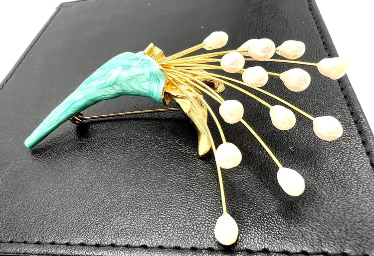 Amazing Vintage freshwater pearl bouquet brooch . This brooch is a lovely example of a spray of freshwater pearls with green enamel highlights. Perfect as a wedding bouquet brooch. Elegant and feminine- this piece really stands out as a quality brooch. Measurement: 3 1/2 inches long by 2 inches wide Condition: Excellent Vintage Condition.