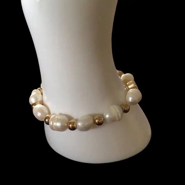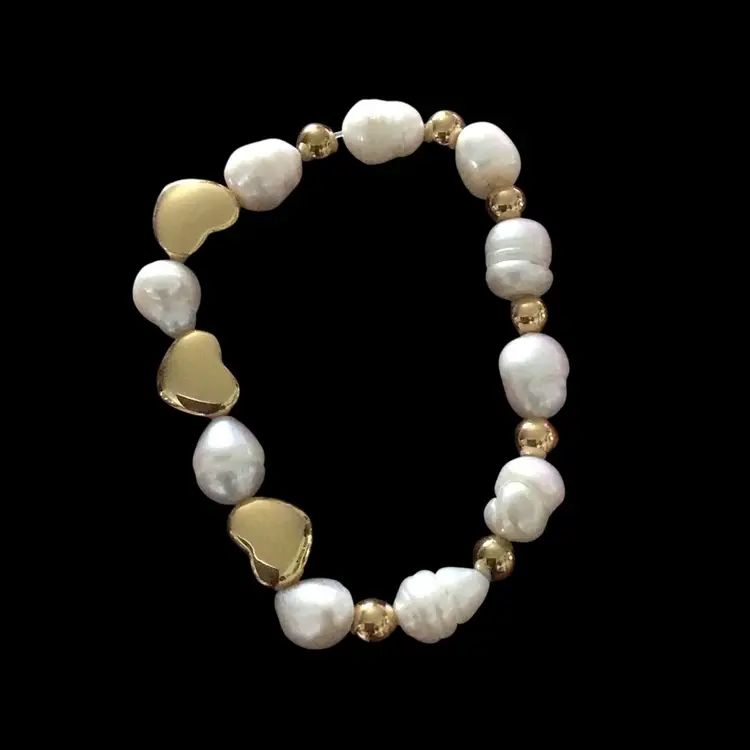 Baroque pearls with gold tone hearts & accent beads stretch 7”. #119
