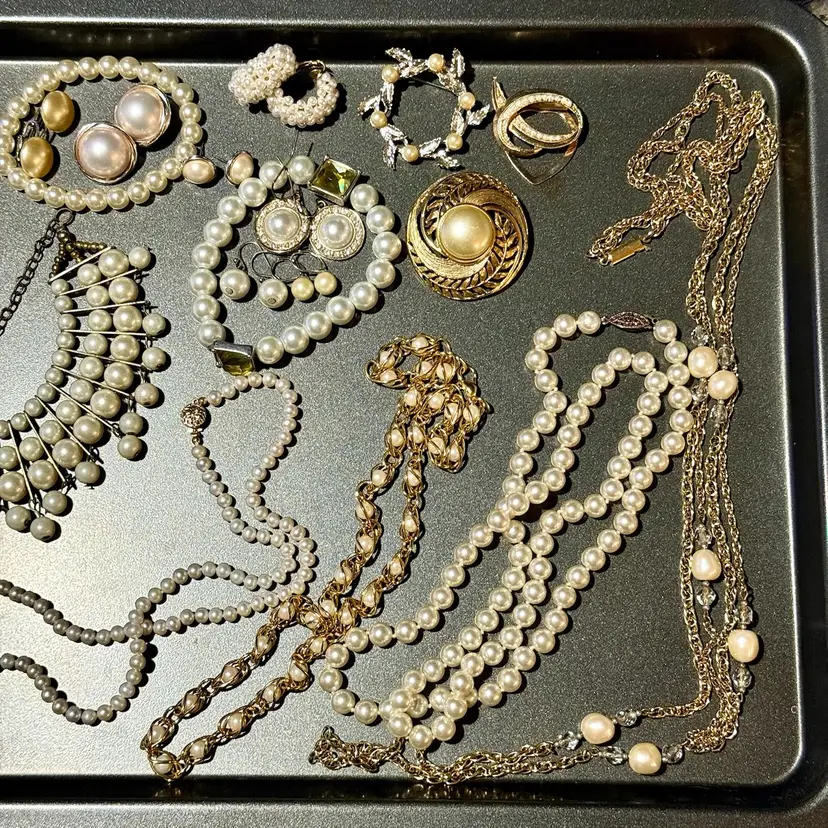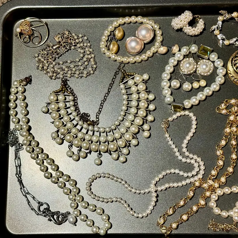 21 pcs: 7 necklaces; 7 pairs earrings (4 pierced/3 clip); 3 brooches; 3 bracelets; 1 scarf clip