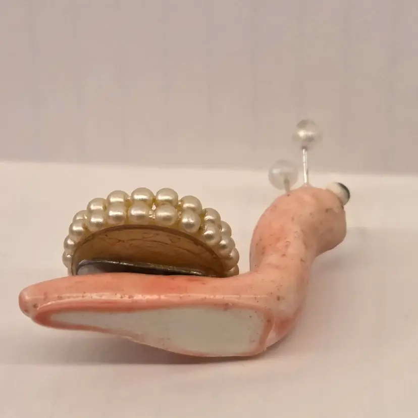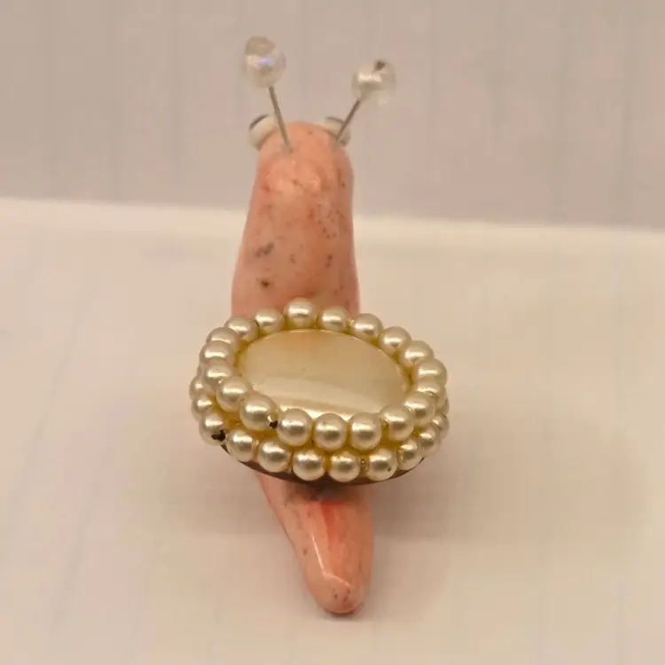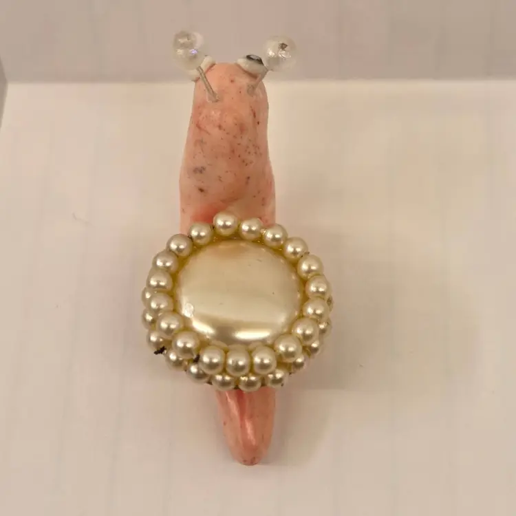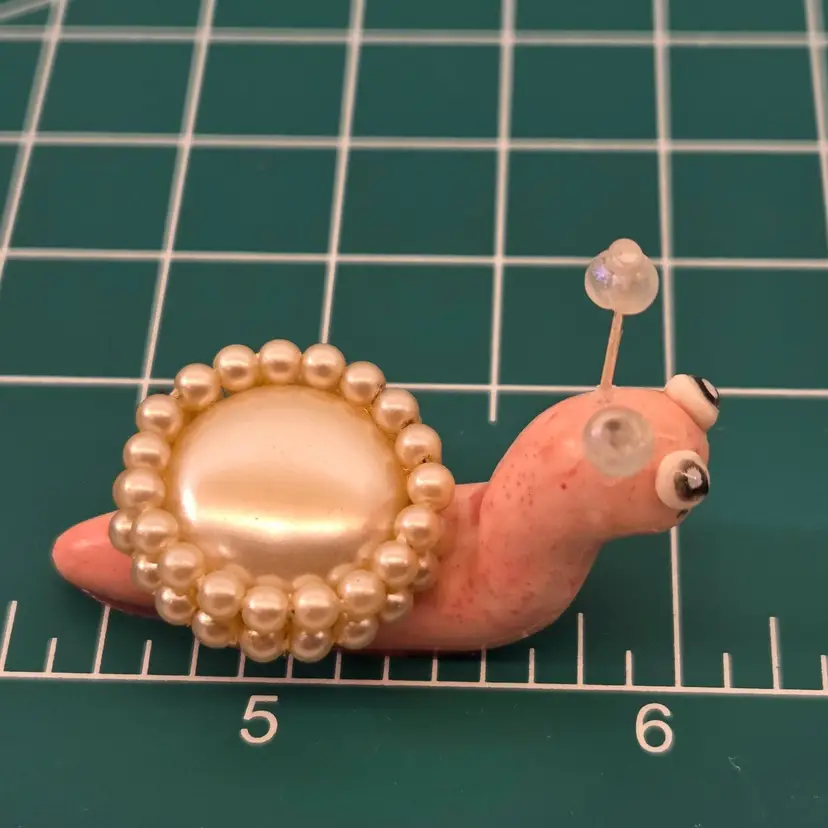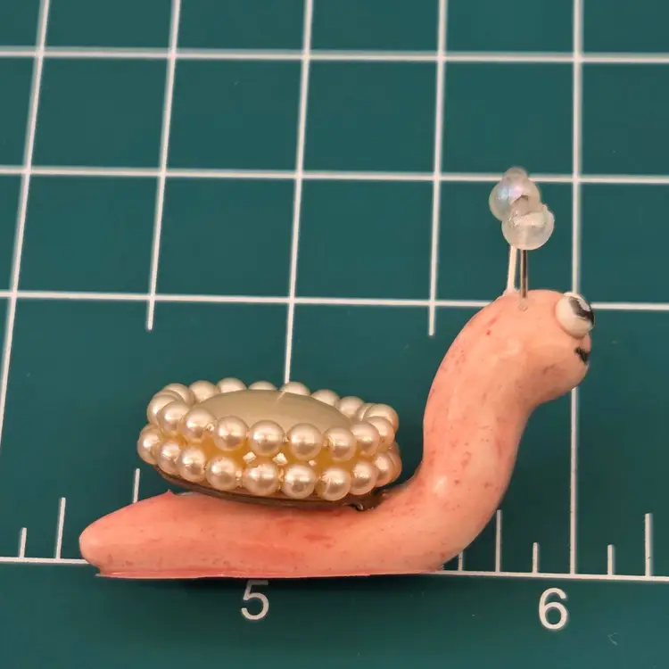 This Gal is made with an upcycled vintage faux pearl clip-on earring on her back. Her antennae are made from iridescent beads.