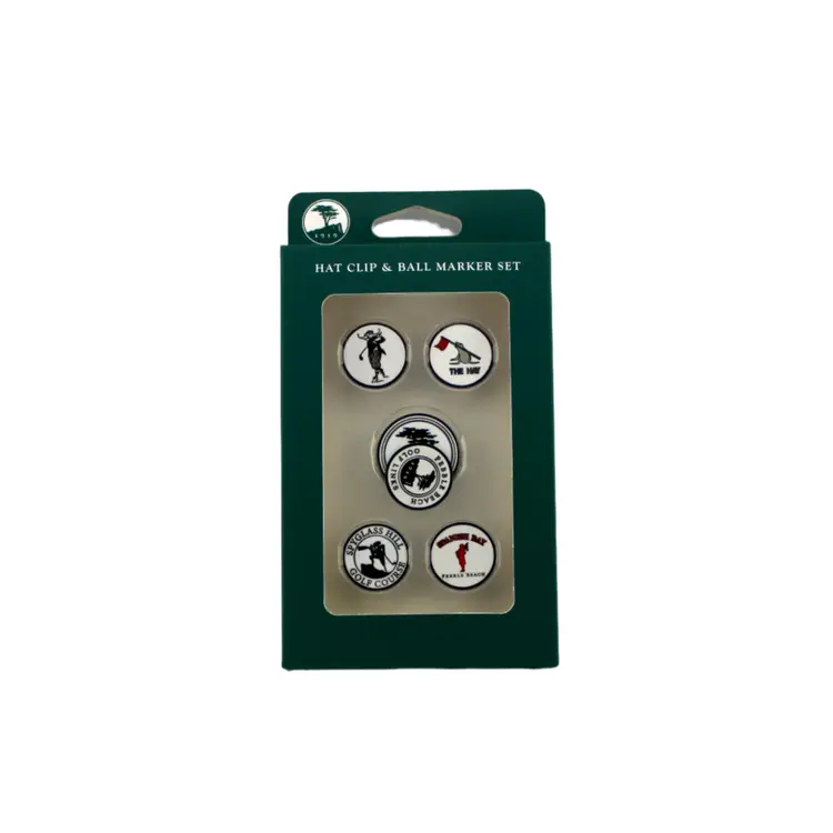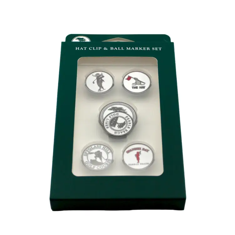Score a hole-in-one on style with the Pebble Beach Hat Clip and Ball Marker Set. Designed with Pebble Beach, Spanish Bay, Spy Glass Hill, and The Hay in mind, this set is perfect for the quirky and fun golfer who wants to stand out on the course. Keep your hat and ball marked with this unique set - it's a real tee-rific choice!