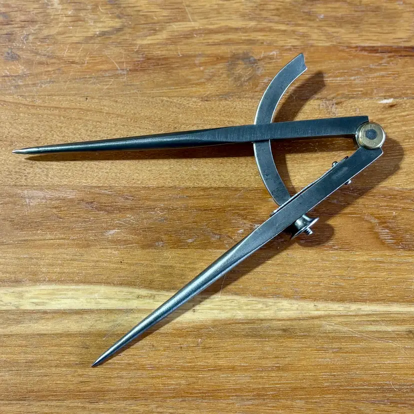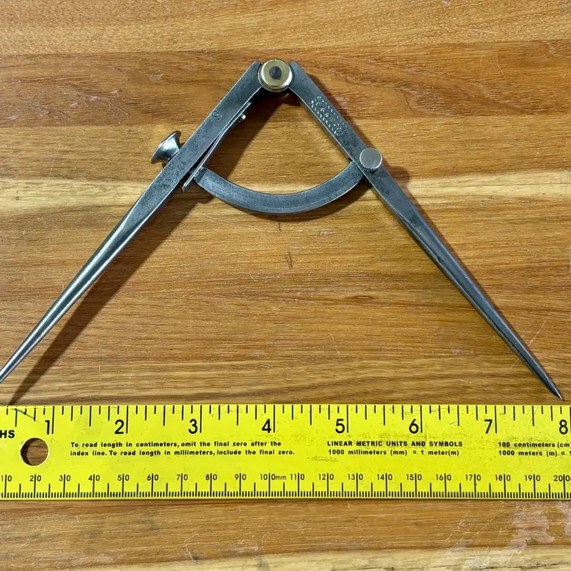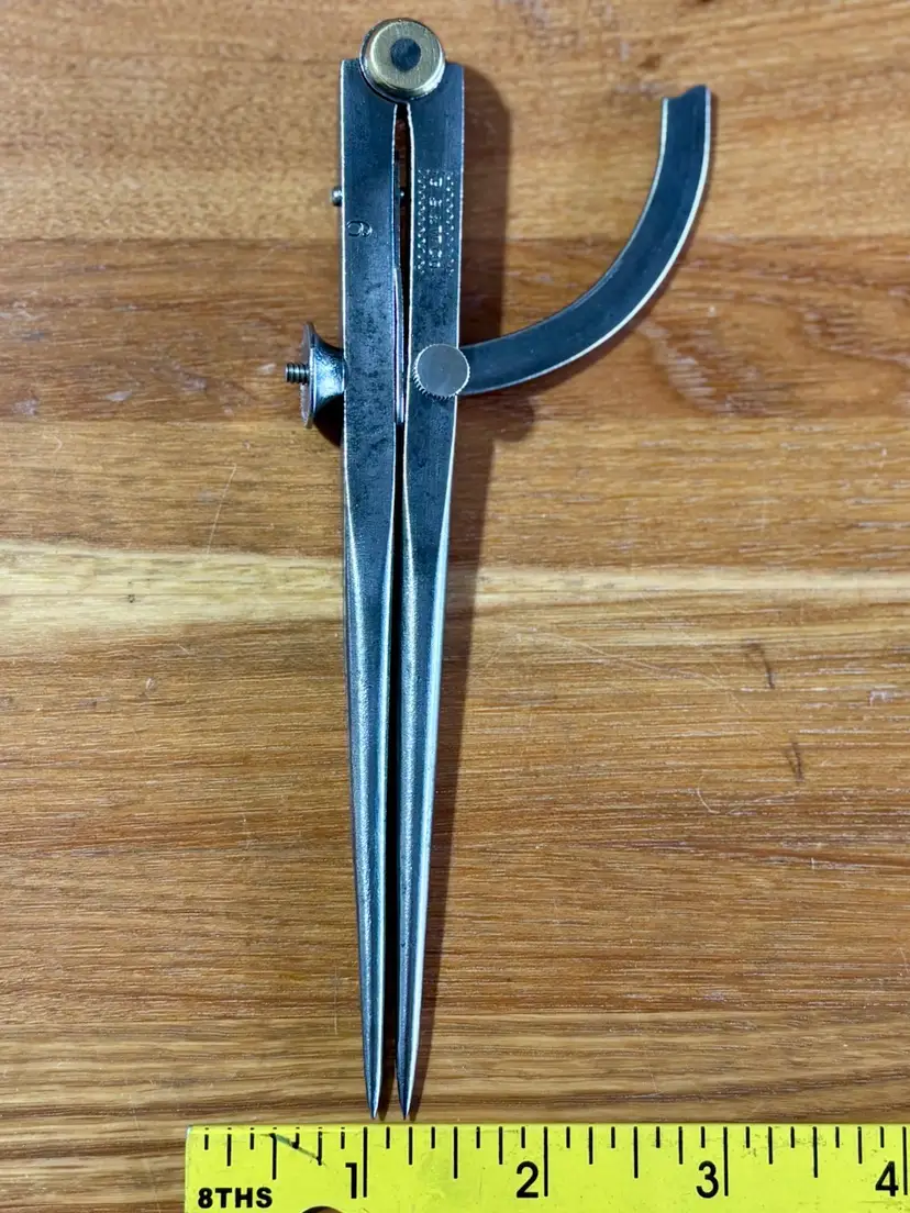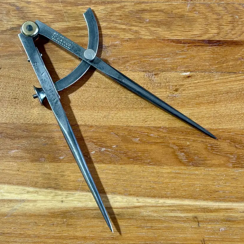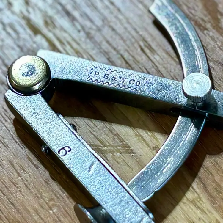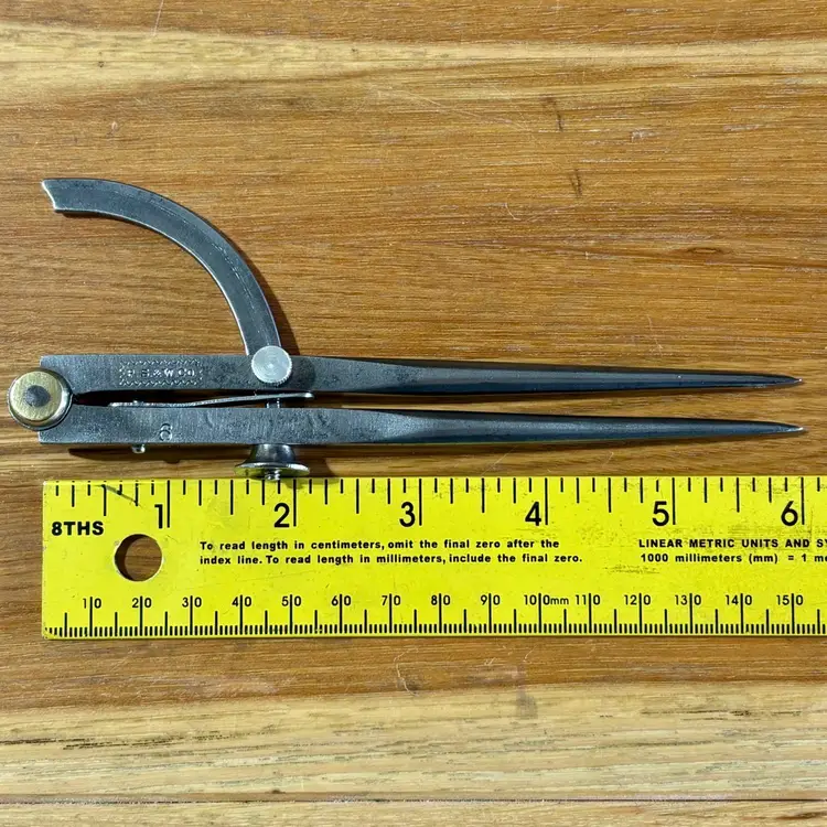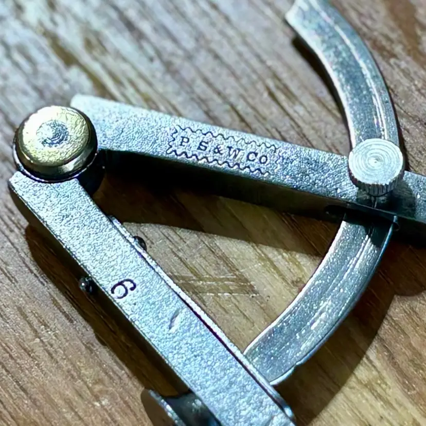 Vintage Peck Stow & Wilcox Tool Company Winged Dividers. Measures 6" in length when closed and has a wingspan of 8" when fully opened. Maker's mark "P. S. & W. Co." is visible on one leg inside of a fluted rectangle, with a "6" on the other. The pivot point of the dividers has a brass accent on both sides. See pictures for details. Let me know if you have any questions.