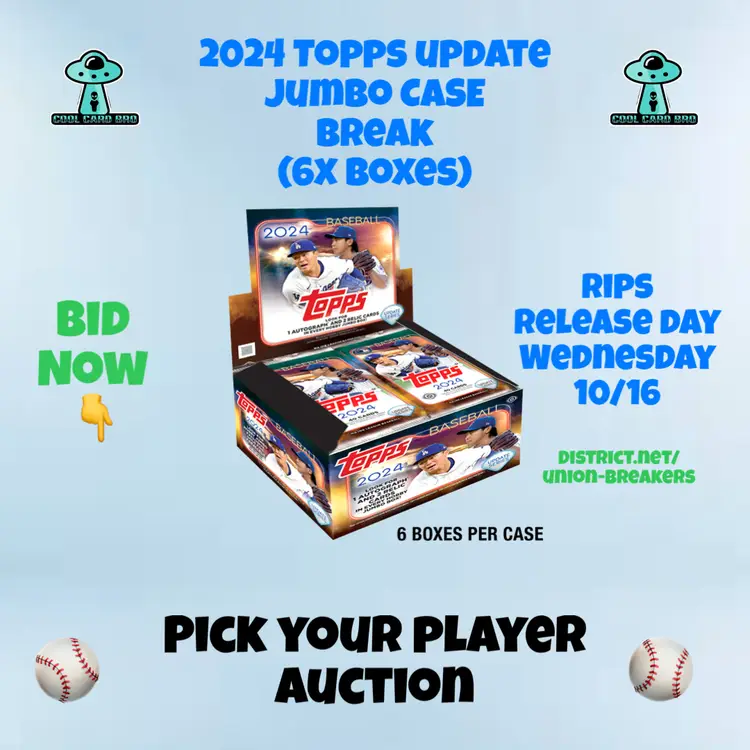 You are bidding on all the cards of the player listed in the title in this JUMBO Case (6x Jumbo Boxes) of 2024 Topps Update Baseball Cards. Auctions end on Tuesday October 15th; case rips on Release Day Wednesday October 16th in the evening. Opening will be viewable & simulcast on Union Breakers x Pats Pulls District as well as simulcast to Twitch. US Shipping is $4.50 for your first auction spot won and only $.25 per additional spot won after that! Any spot won where no cards of the player are found in the box will receive a bonus card from Cool Card Bro's collection. Any hit pulled (On the Spot, Sketches, Hidden Gems etc) of a player who is NOT listed in the auction will be assigned by draw between all participants. Checklist COMBO CARDS have 1 combined spot; Any other dual or multi-player #'d or auto cards featuring multiple players will be assigned live between the spots depicted on the card.