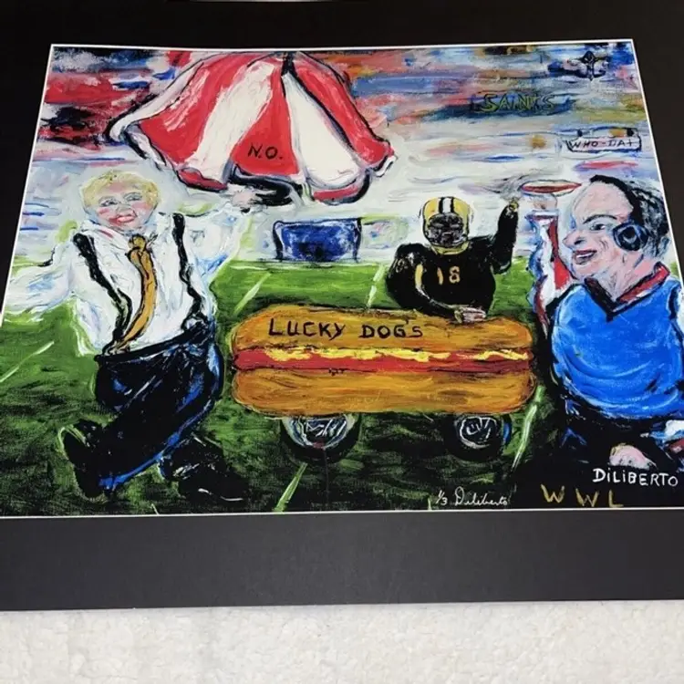 Peggy Diliberto Signed Art Poster New Orleans saints lucky dog 24 x20 Matted saints