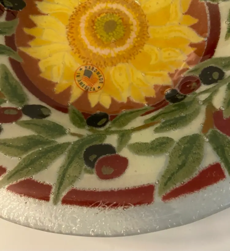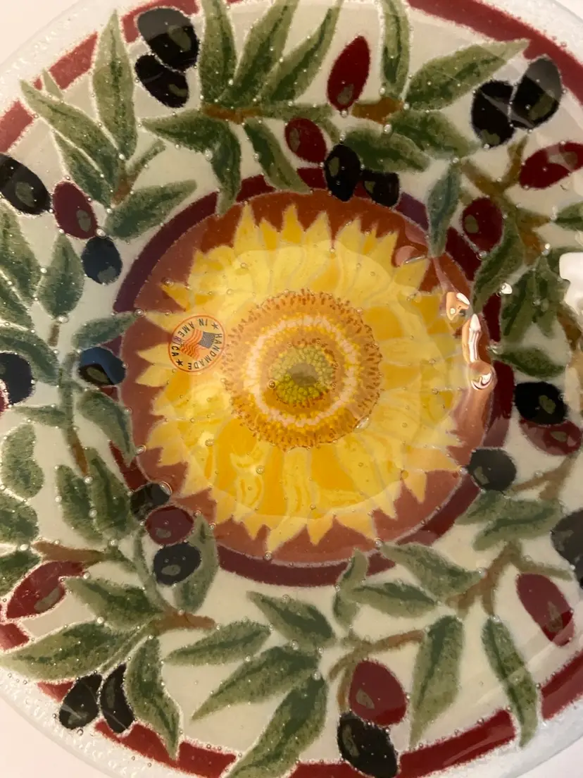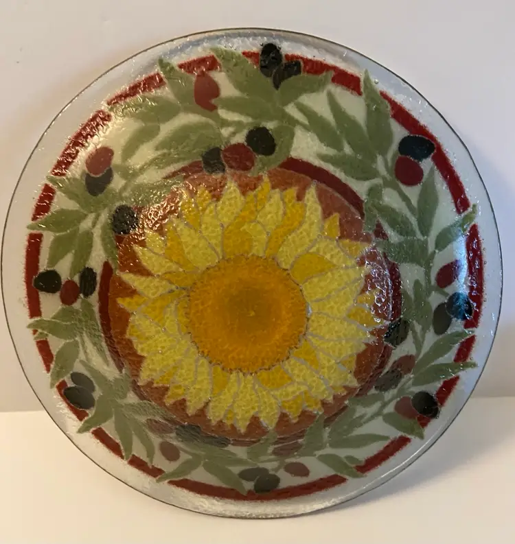 8 inch round fused glass bowl created by Peggy Karr. This is decorated in a Tuscan theme with a beautiful sunflower in the center and bordered with Olive branches. Bowl is signed by the artist and is made in America. Perfect condition with no chips or cracks.