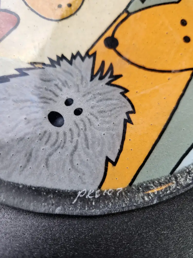 Peggy Karr 8" Fused Glass Plate with a "Dog Pound" pattern. Signed. No chips or cracks.