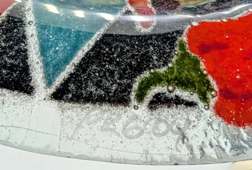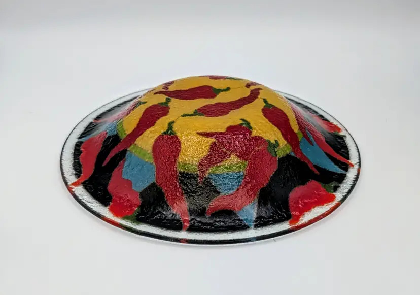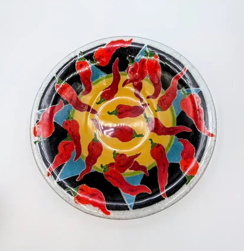 Colorful fused art glass bowl by American glass artist Peggy Karr featuring a vibrant chili pepper design. The bowl displays layered glass construction with bright red peppers surrounding a yellow center against a black background. The underside is signed and dated by Peggy Karr, confirming studio production. This piece works beautifully as a decorative accent, serving bowl, or collectible art glass item. Measurements Diameter: 8.5 inches Height: approx. 2 inches Excellent pre-owned condition. No chips or cracks. Light wear consistent with normal handling.