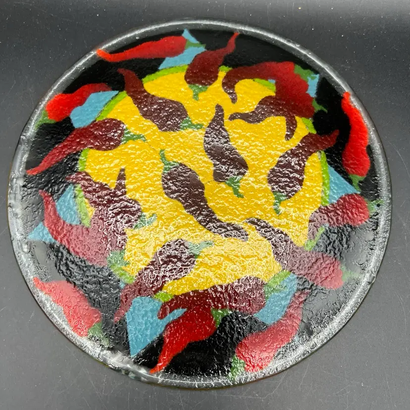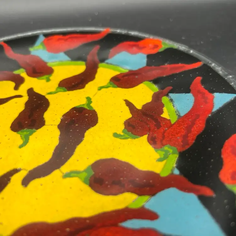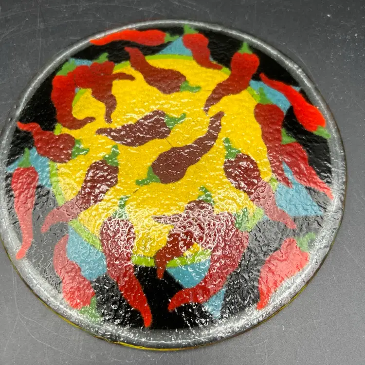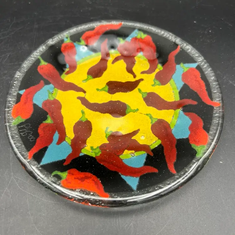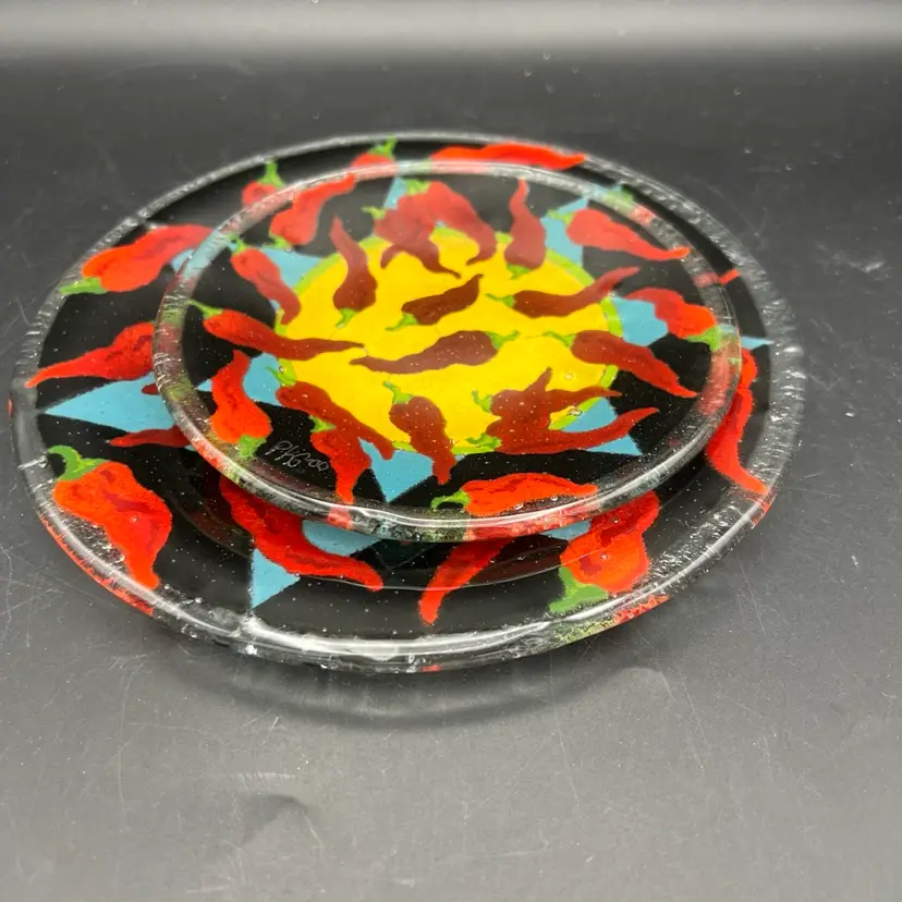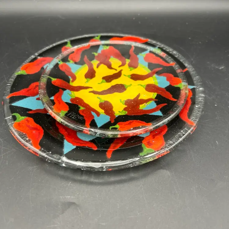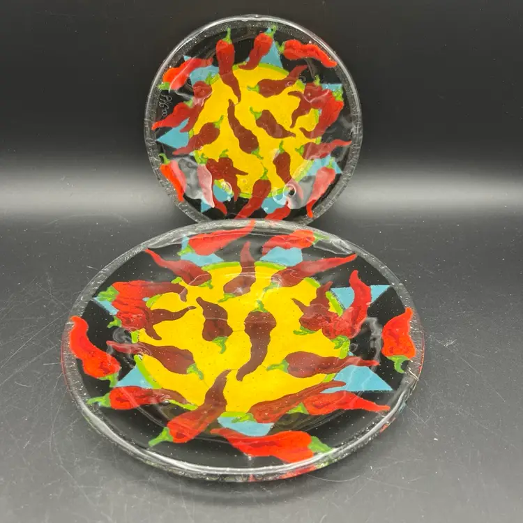 Spice up your dinnerware collection with these Peggy Karr fused glass dessert plates featuring colorful chili pepper designs. The set includes two plates, one measuring 7.75" and the other 5.75". The smaller one is signed PKG 00. The larger one is not signed.