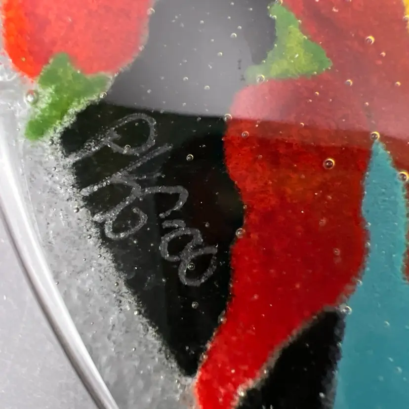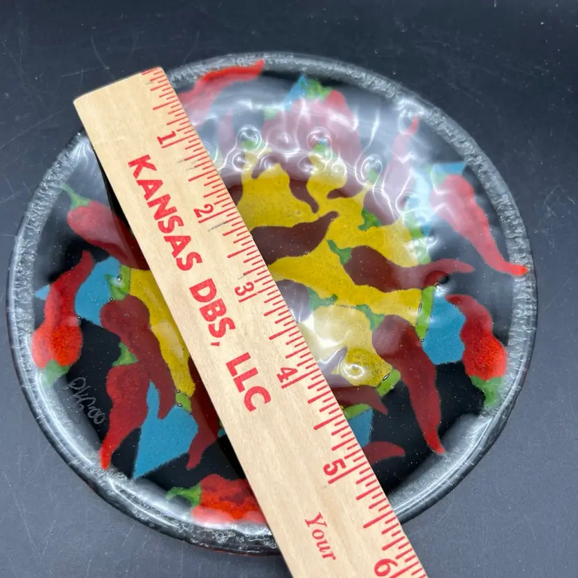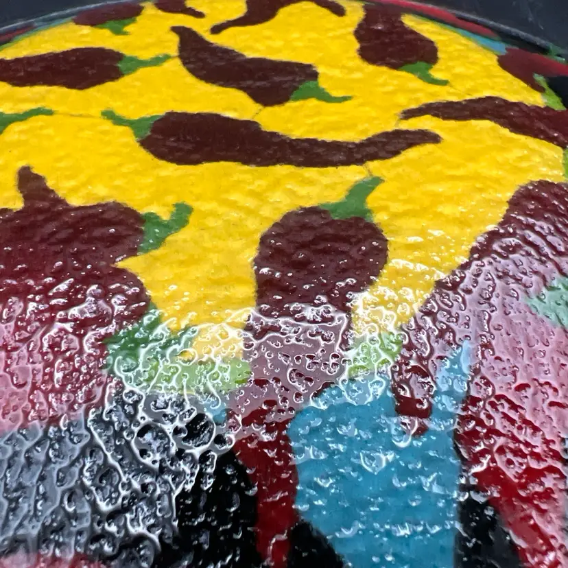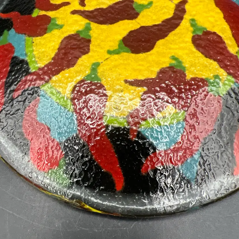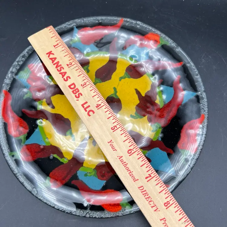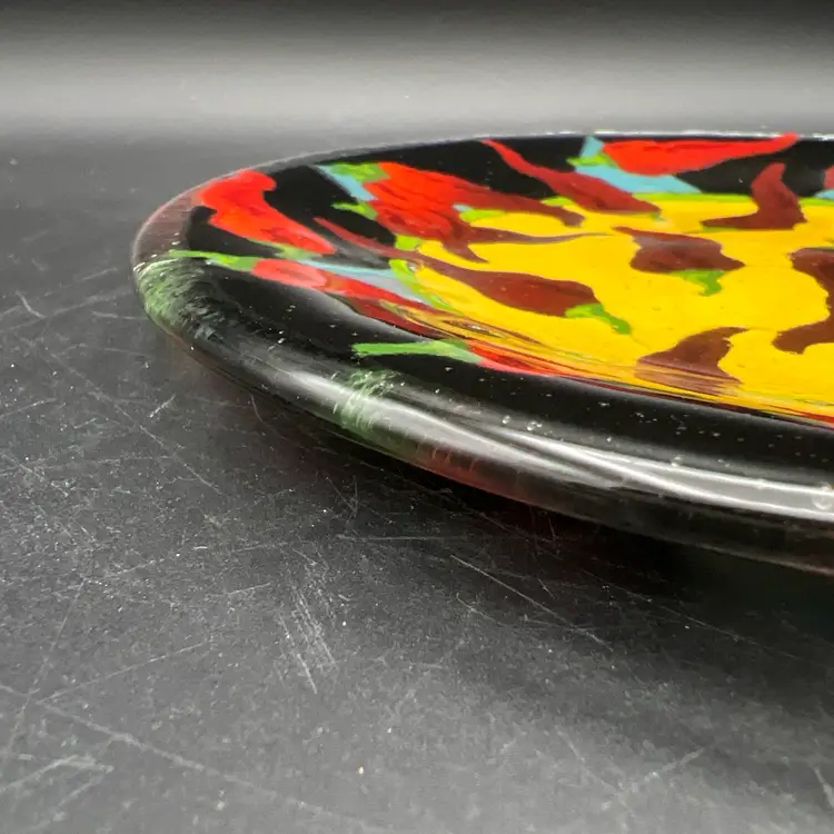 Spice up your dinnerware collection with these Peggy Karr fused glass dessert plates featuring colorful chili pepper designs. The set includes two plates, one measuring 7.75" and the other 5.75". The smaller one is signed PKG 00. The larger one is not signed.