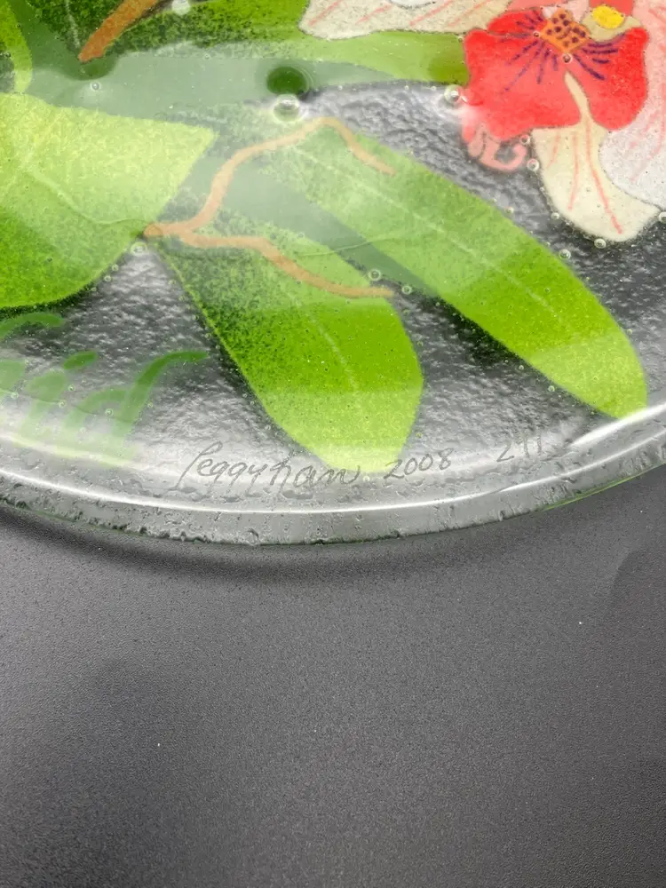 Stunningly beautiful and somewhat hard to find (numbered 291), This Peggy Karr plate will brighten any decor or table. Measures 11.25” diameter and just over 0.5” tall at the edges. Excellent condition. Signed. Made in New Jersey.