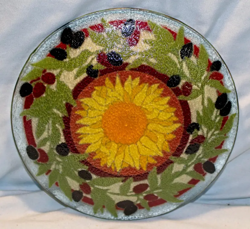 Peggy Karr Fused Glass Sunflower Olive Desert Plate 7.75" Diameter Signed. In good condition. 7.75" diameter x .25" high.