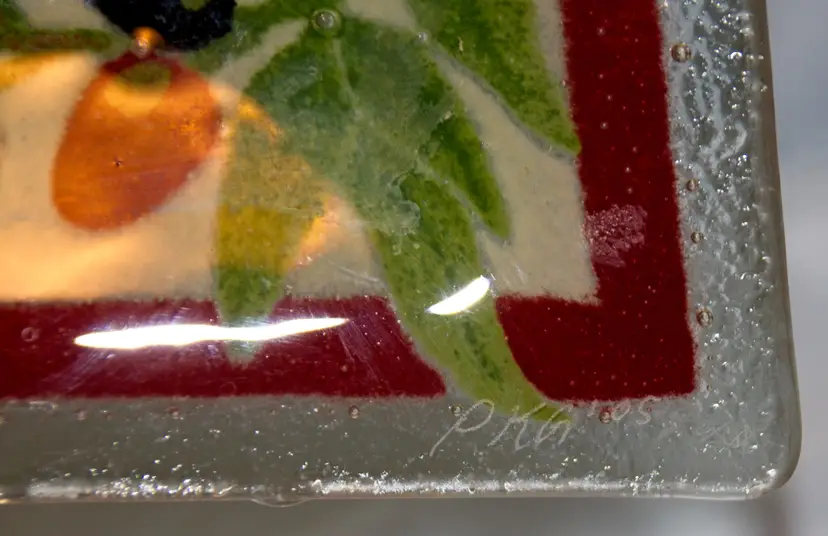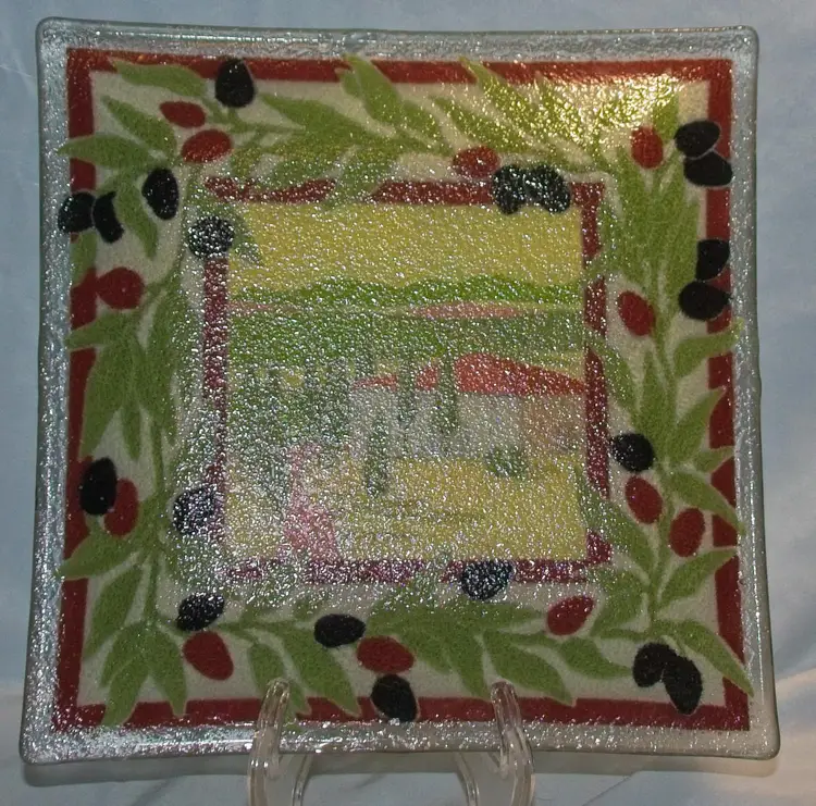 Peggy Carr Fused Glass Tuscan Villa Tray 9.75". In good condition. 9.75" wide x 9.5" long x .50" tall