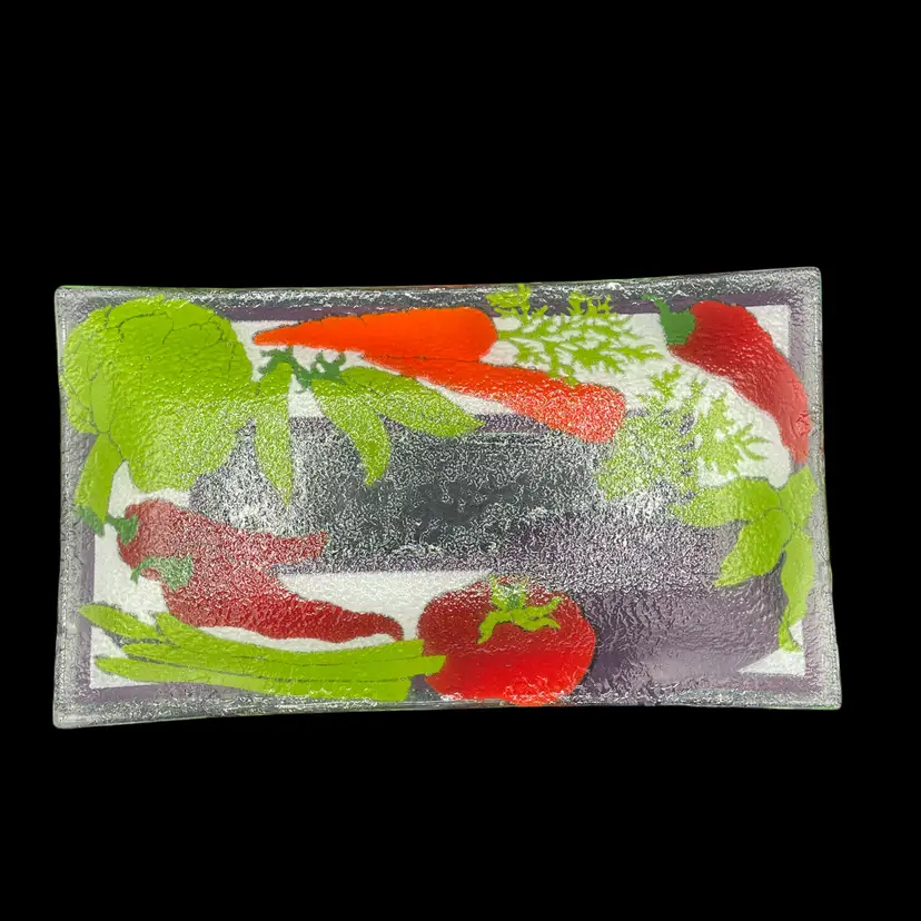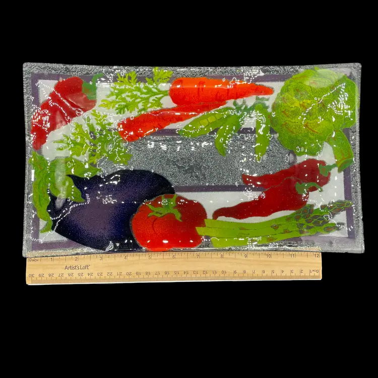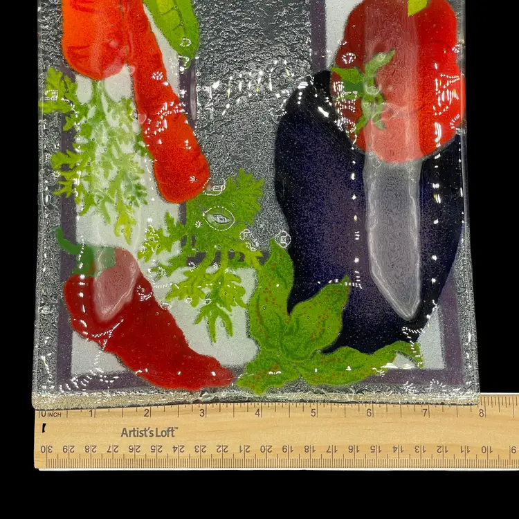 The Peggy Karr Glass 2001 Gourmet Garden 14” Rectangular Fused Glass Plate is a beautiful piece of American glass art designed by Diane Johnston. This original piece features a vibrant multi-color design, showcasing the intricate fusion technique that Peggy Karr Glass is known for. The plate is part of the Gourmet Garden collection and is a unique decorative collectible that would make a stunning addition to any home decor.
