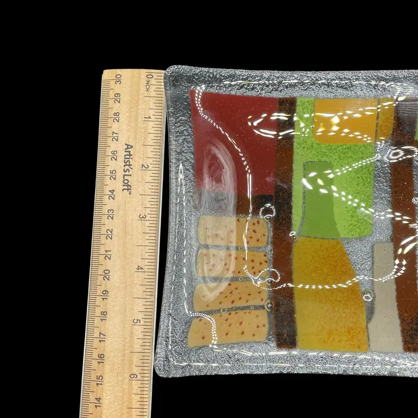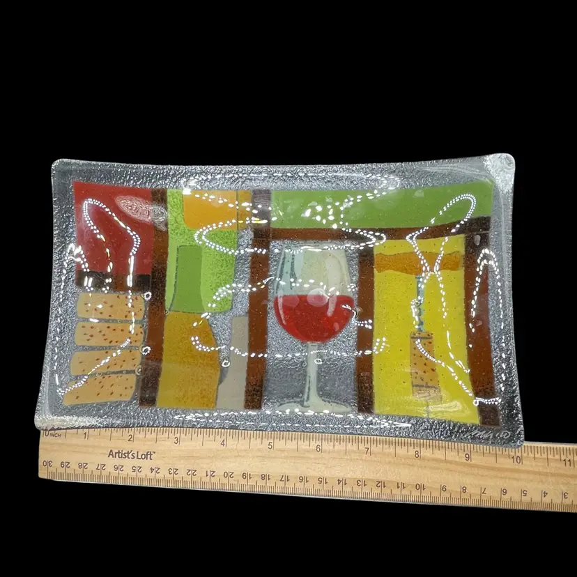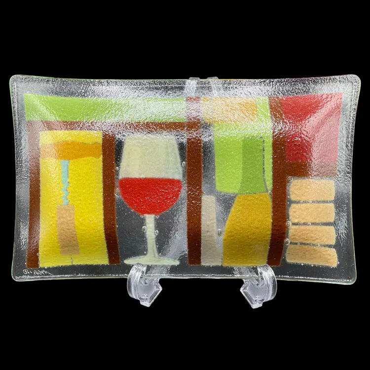 Add a touch of art glass to your collection with this Peggy Karr Glass plate. The beautiful multicolor design is handcrafted using fused glass technique, making each piece unique. This 10"x6" plate features a wine theme, perfect for entertaining guests. Made in New Jersey in the 21st century, this plate is a modern addition to any home decor. Whether you're a collector or just looking for a beautiful piece to display, this Peggy Karr Glass plate is a must-have.