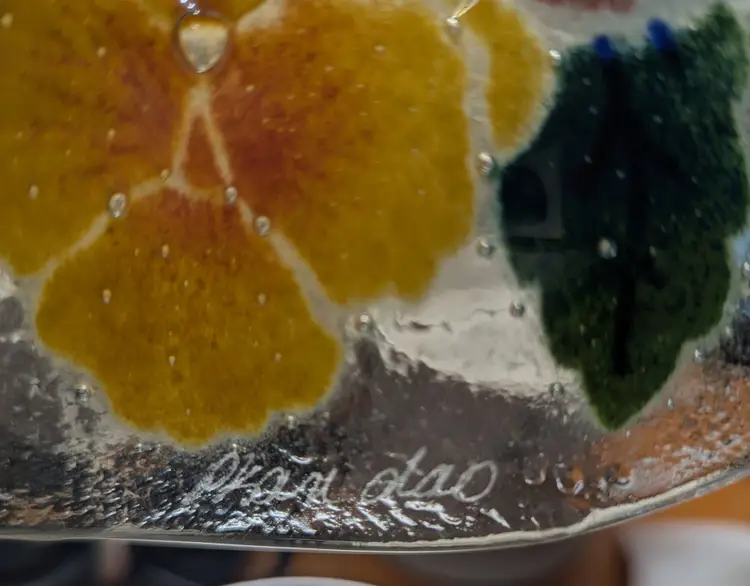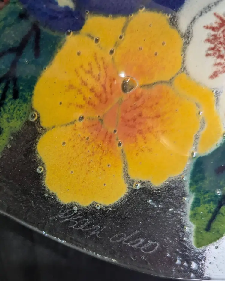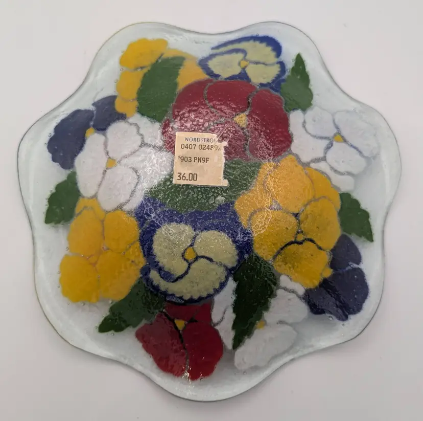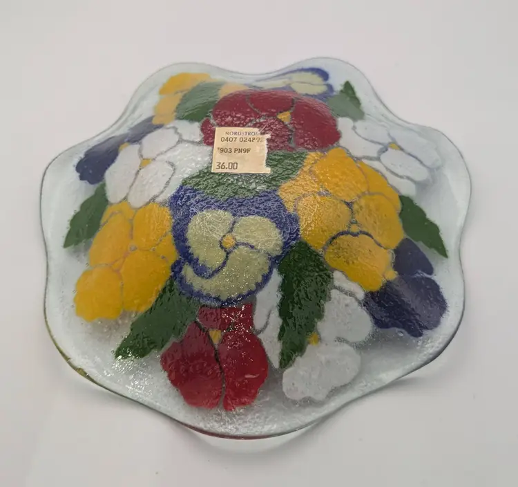 Beautiful Peggy Karr Pansy Fluted Fused Glass bowl. Measures 8.5 in cross across and approx.2 inches in depth. Signed- etched in by Artist. Would be nice addition to any and all decors This is being sold as used- it was propped in cupboard over the years- original Nordstrom tag still attached. No chips, cracks or issues. Non smoking home Non pet Home.