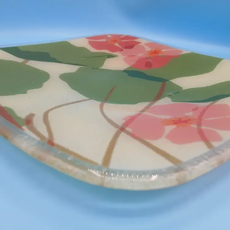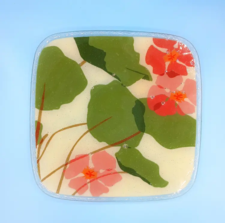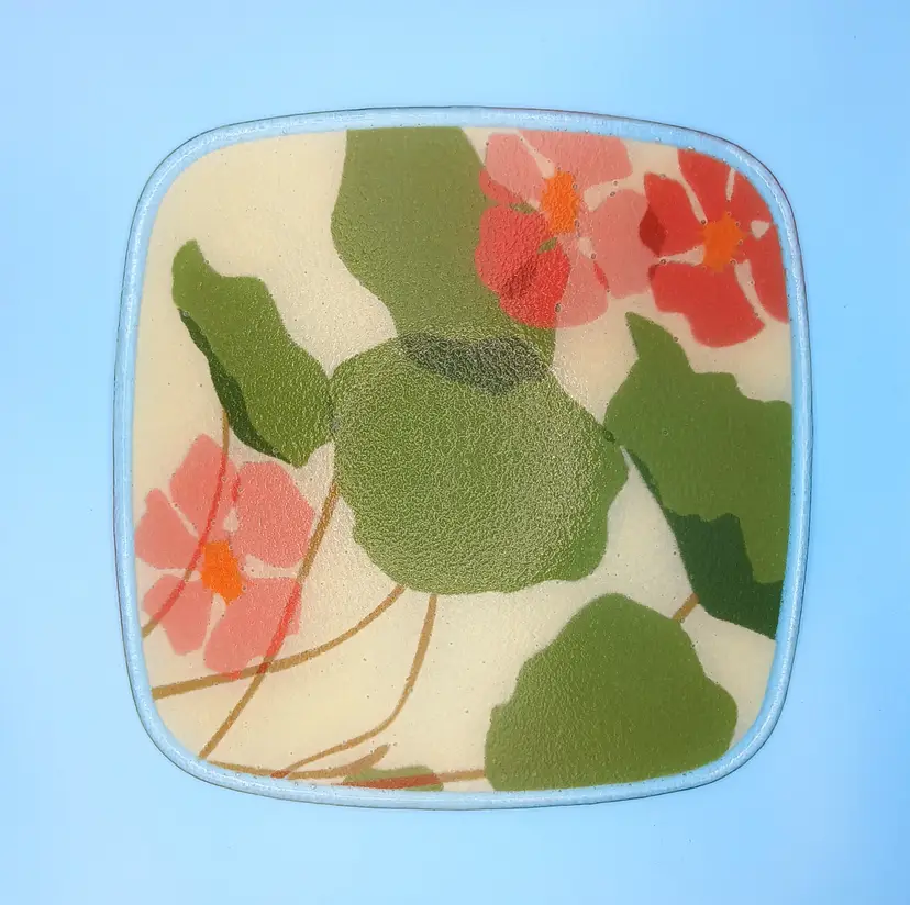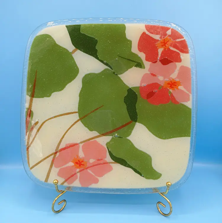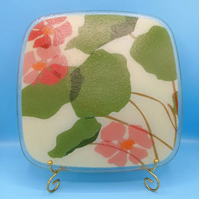 Excellent condition. This fused glass plate by Peggy Karr measures slightly over 11"x11". It's signed and dated on the bottom right corner. Thanks for looking!