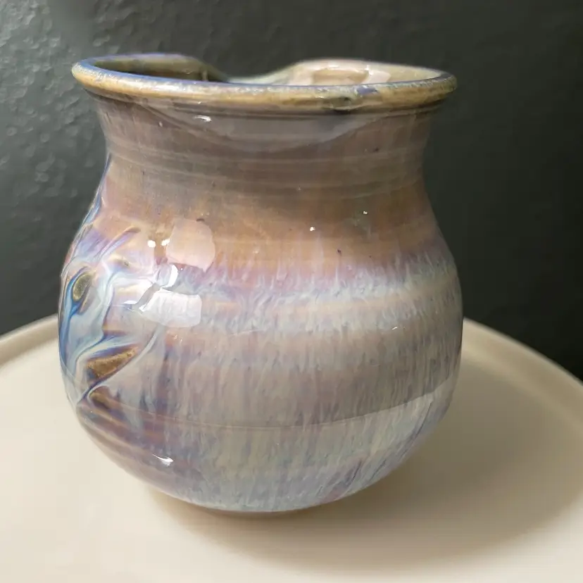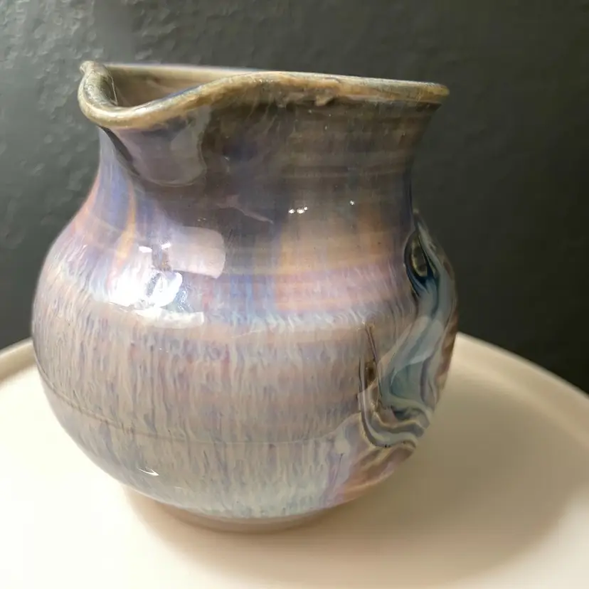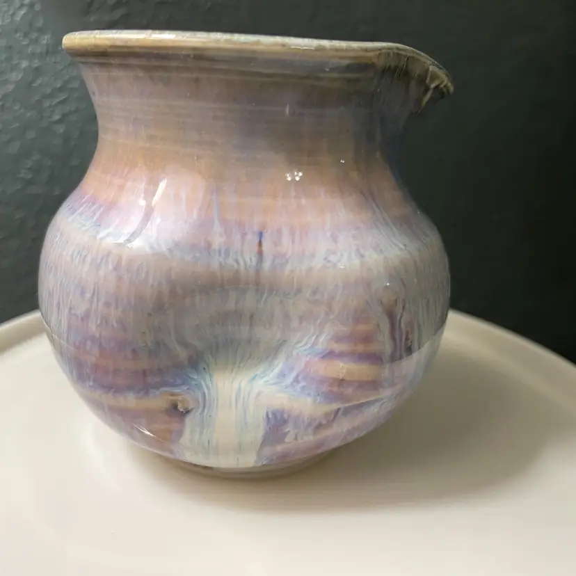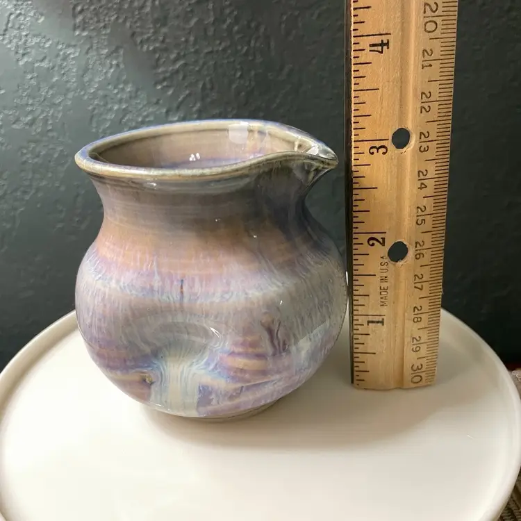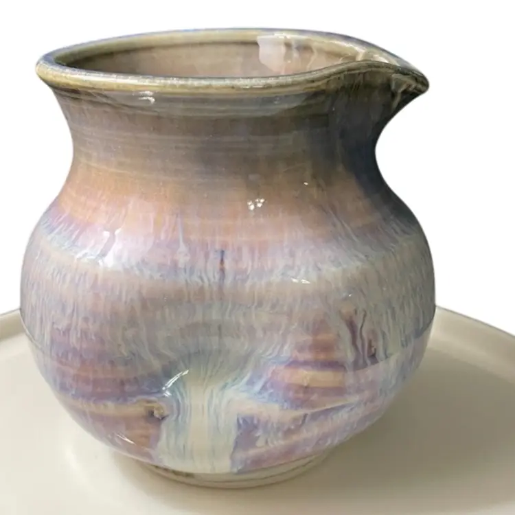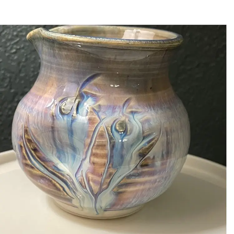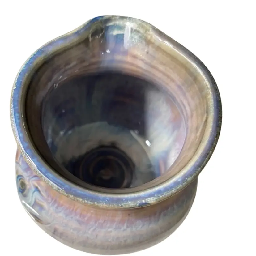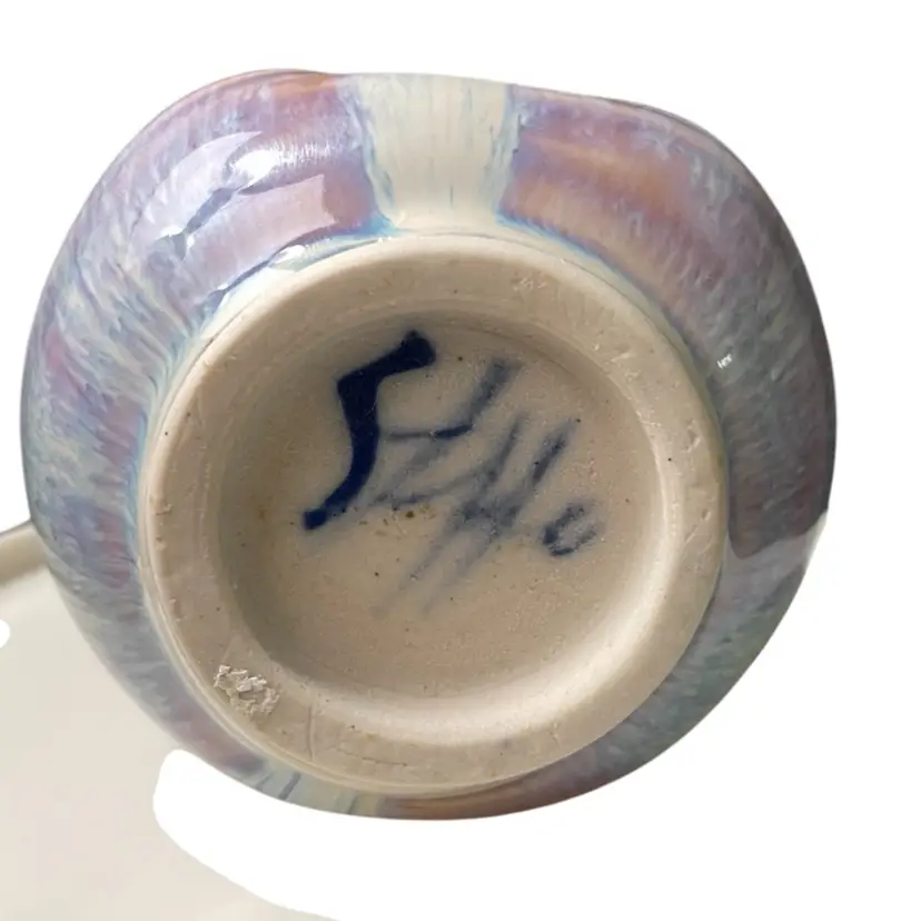 This piece is gorgeous. Very Good used condition . Indents on sides for pouring. Glossy glaze in purples and blues .
