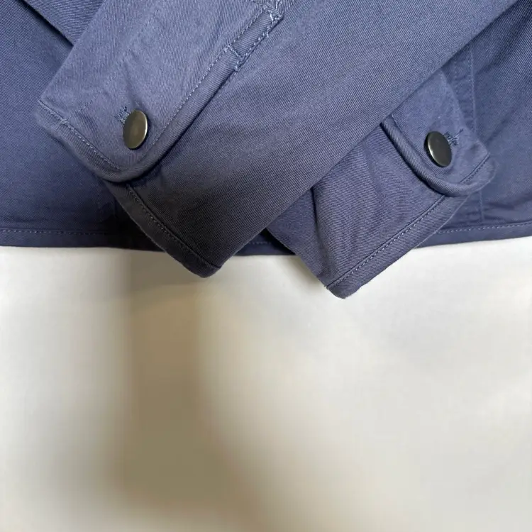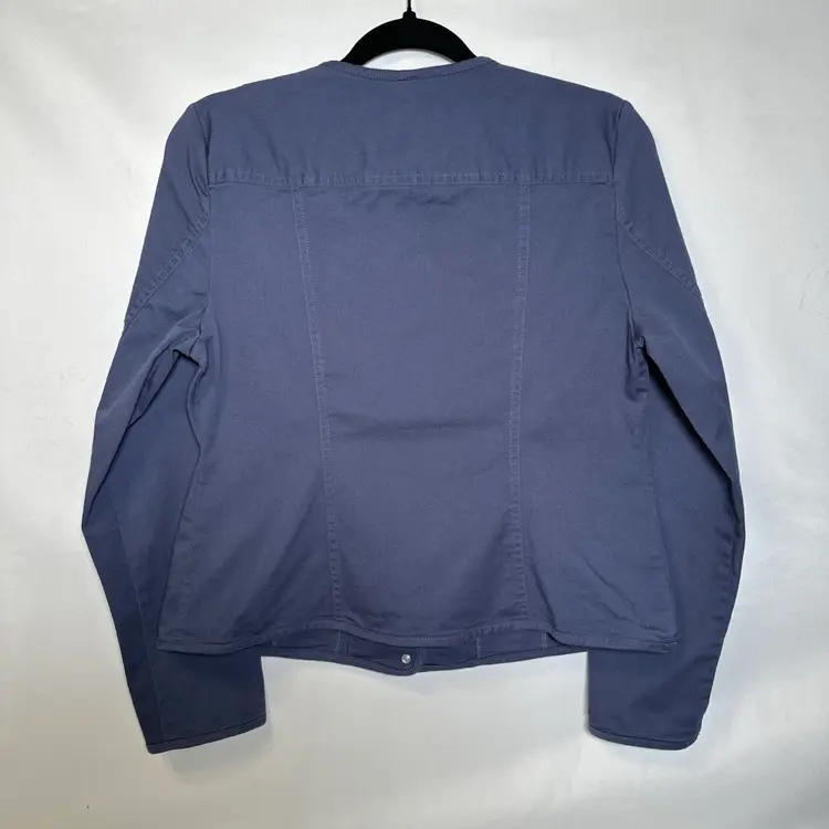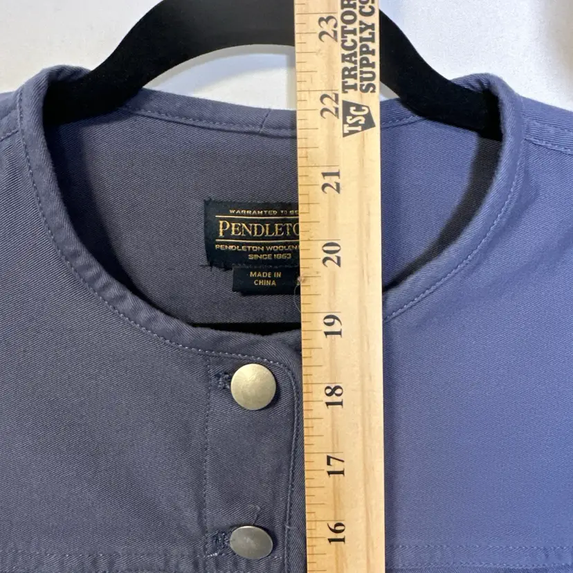 This is a Pendleton jacket for women in size M with a crew neck and long sleeves. It is made of cotton in a navy blue color with silver buttons. The style is a basic jacket with a theme of metal elements.