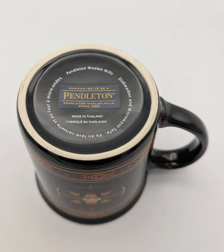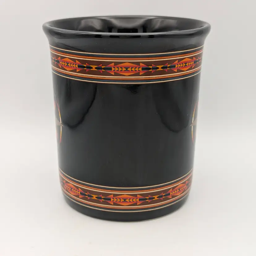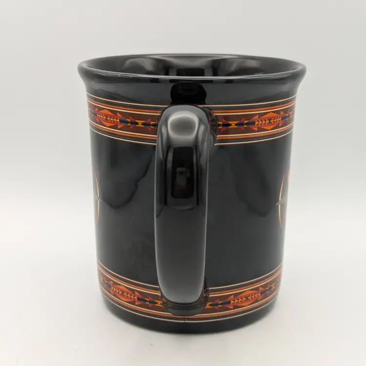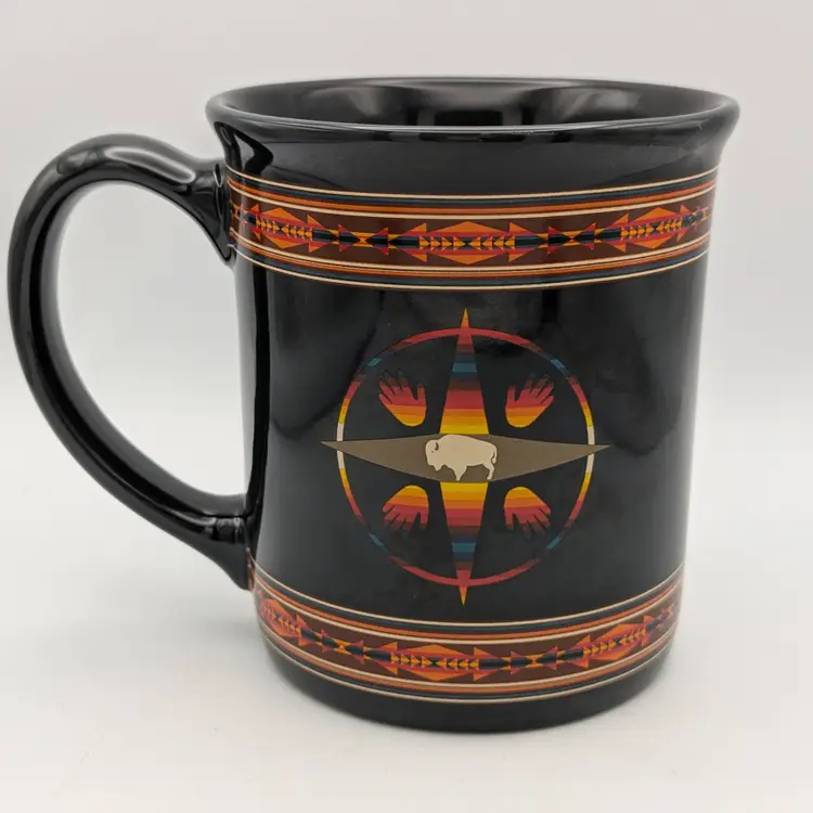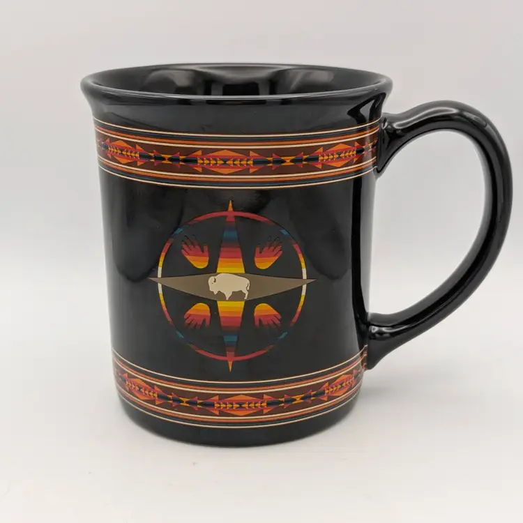 This is a generous sized ceramic mug by Pendleton company. The design is based on their Big Medicine blanket pattern honoring the sacred power of the rare white buffalo. It holds 18 oz. it is 4.5 inches tall and has a diameter of 4 inches. It is dishwasher and microwave safe- though I never ever used either. The design is on both sides of the mug so it can be viewed from the left or right hand