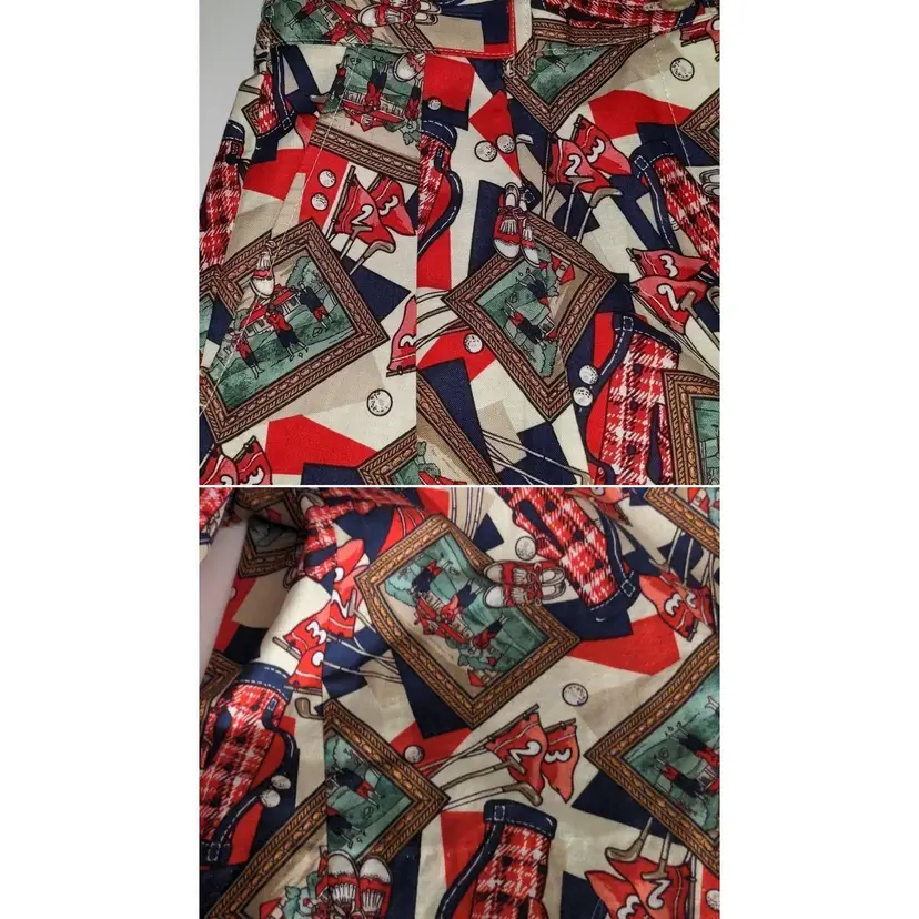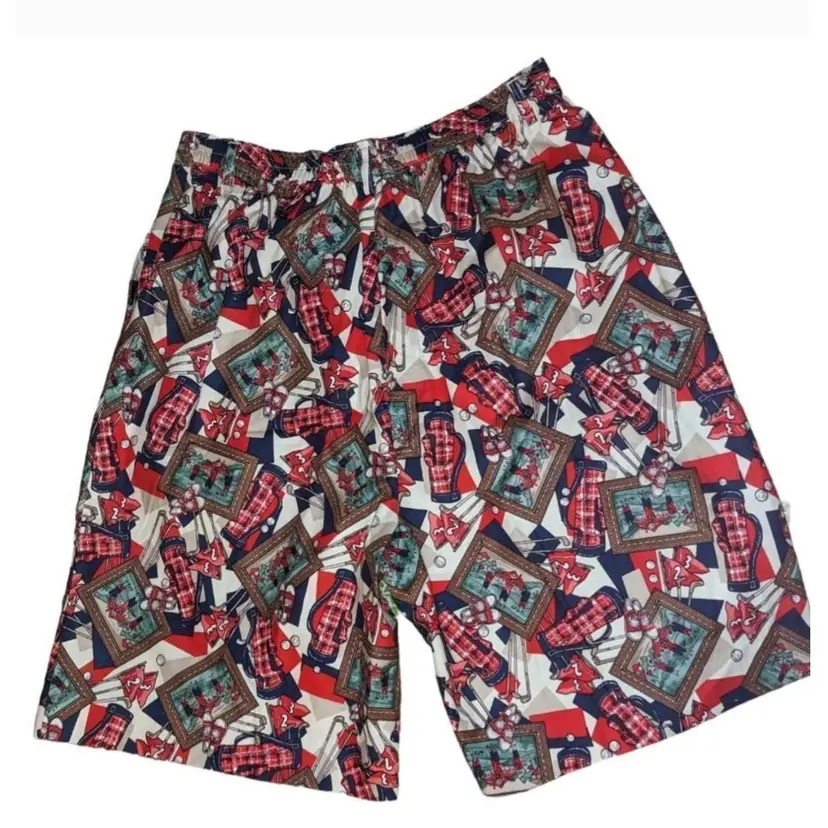 Pendleton vintage golf print knockabout shorts made in the USA size 10 pockets at the sides pleated front elastic Waist 14-17 rise- 13 22 inches long in guc no visible flaws