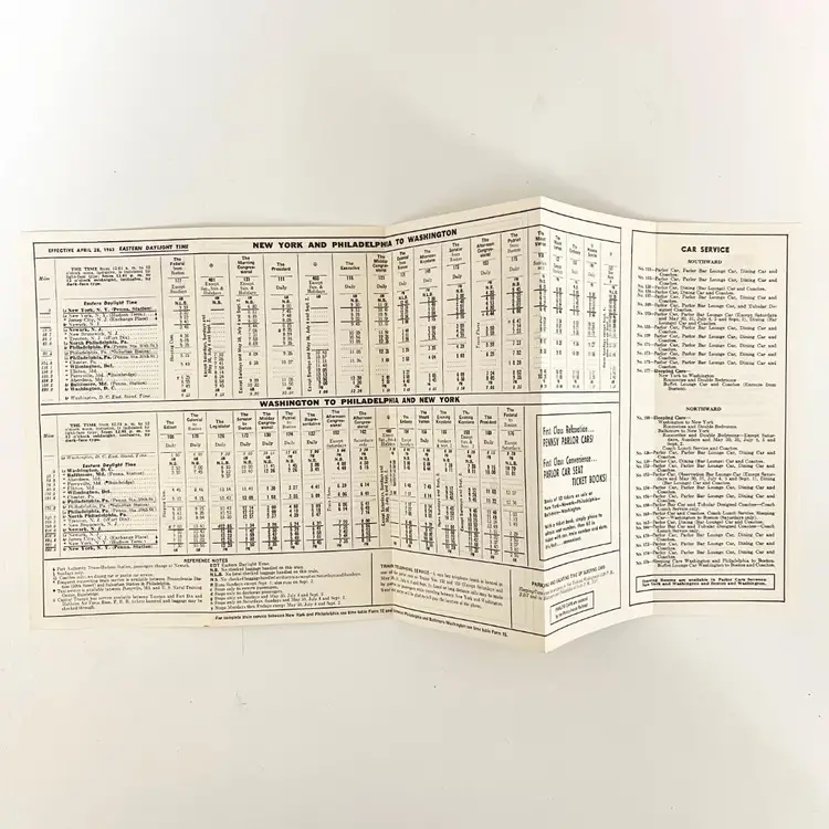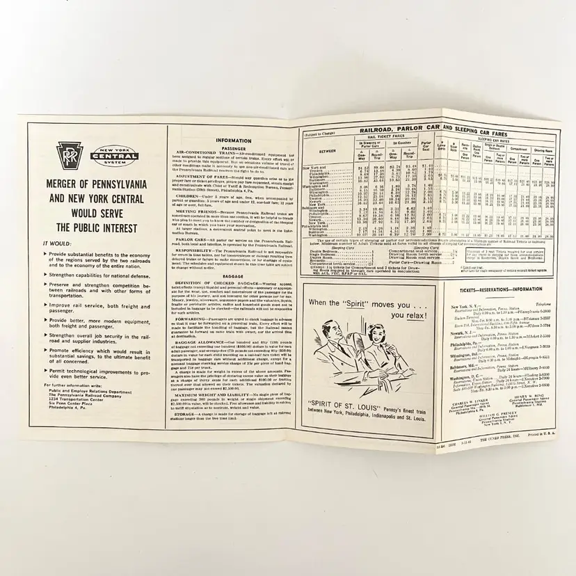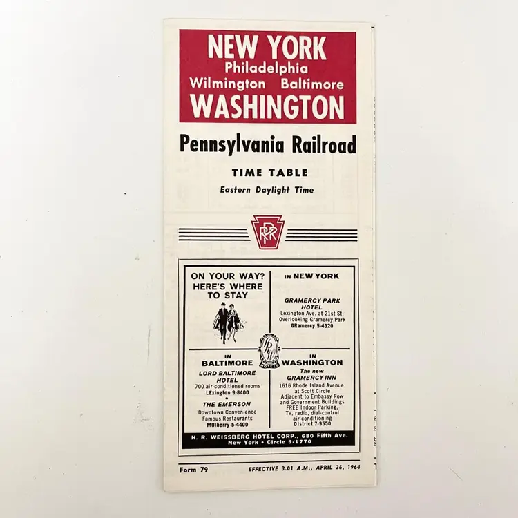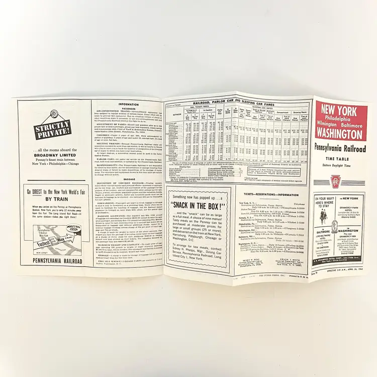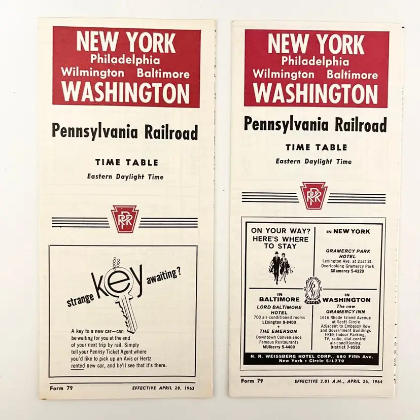 Pennsylvania Railroad Timetable Vintage 1960s Rail Lot of 2 New York, Philadelphia, Wilmington, Baltimore, Washington Railway Train Schedules Passenger, baggage, ticket and reservation information Pennsy parlor car and sleeping car rail fares Gateways to the New York World's Fair – Pennsylvania Station, New York ... and Long Island Railroad's Steel Thruway to the Fair Gateway Merger of Pennsylvania and New York Central HRW H R Weissberg Hotel Advertising Condition: The paper is toned, discolored Measures 7-1/2 inches x 3-1/4 inches Packaged in a plastic sleeve inside a rigid envelope Visit my store to see more vintage ephemera, advertising, novelties, gifts, estate sale and yard sale finds https://district.net/u/finderspickerspaper SKU B27