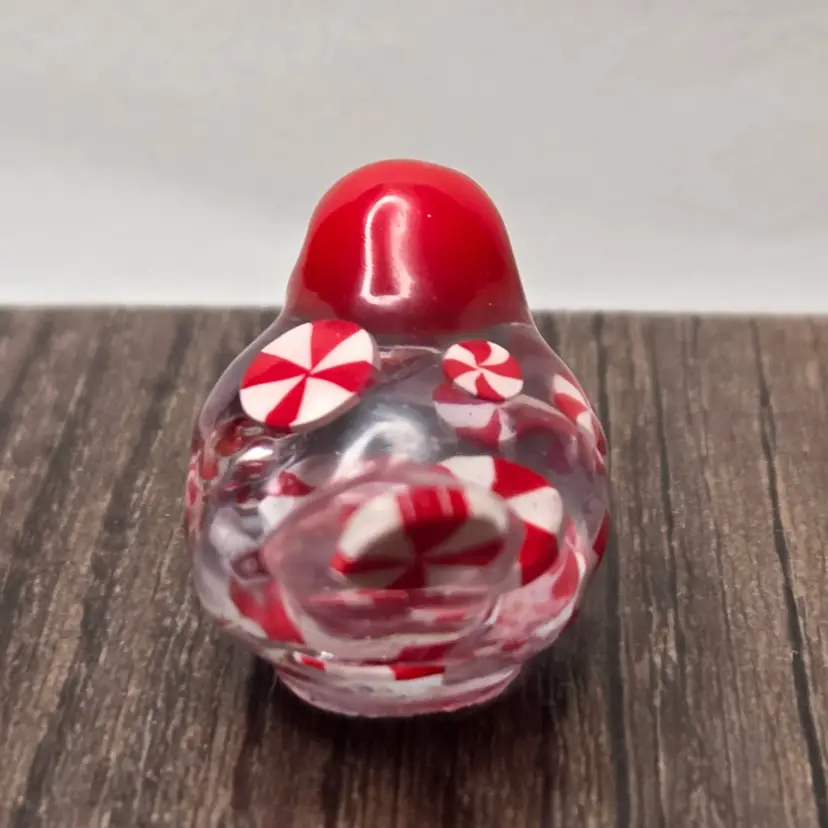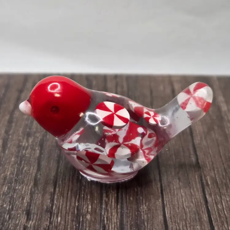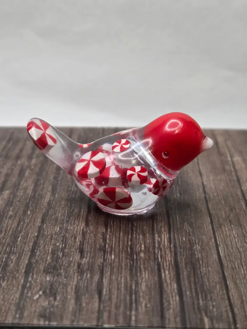 She is made with a white seed bead beak, a red bead from a necklace and her tailfeather and body have peppermint slices cut from a polymer clay cane handmade by me.