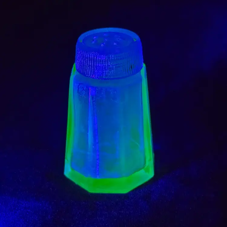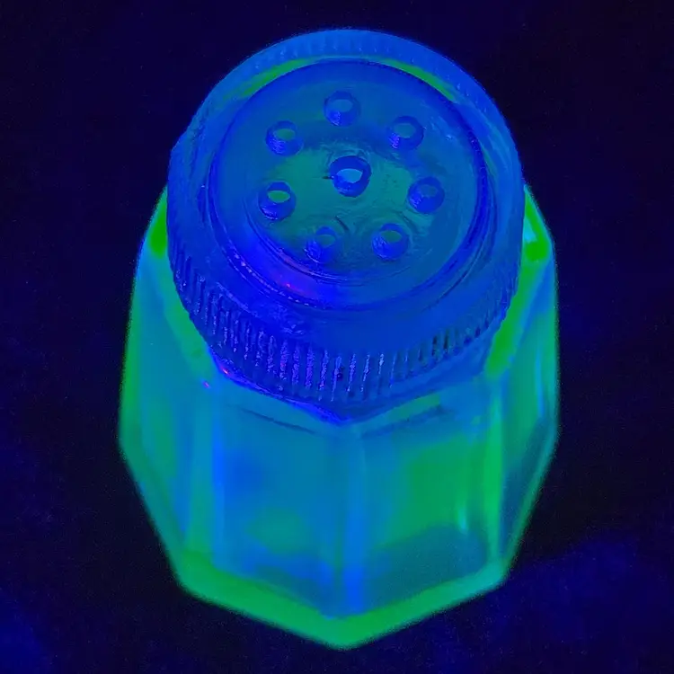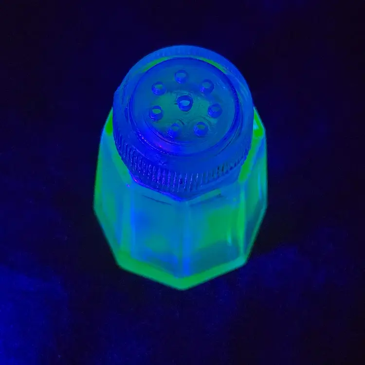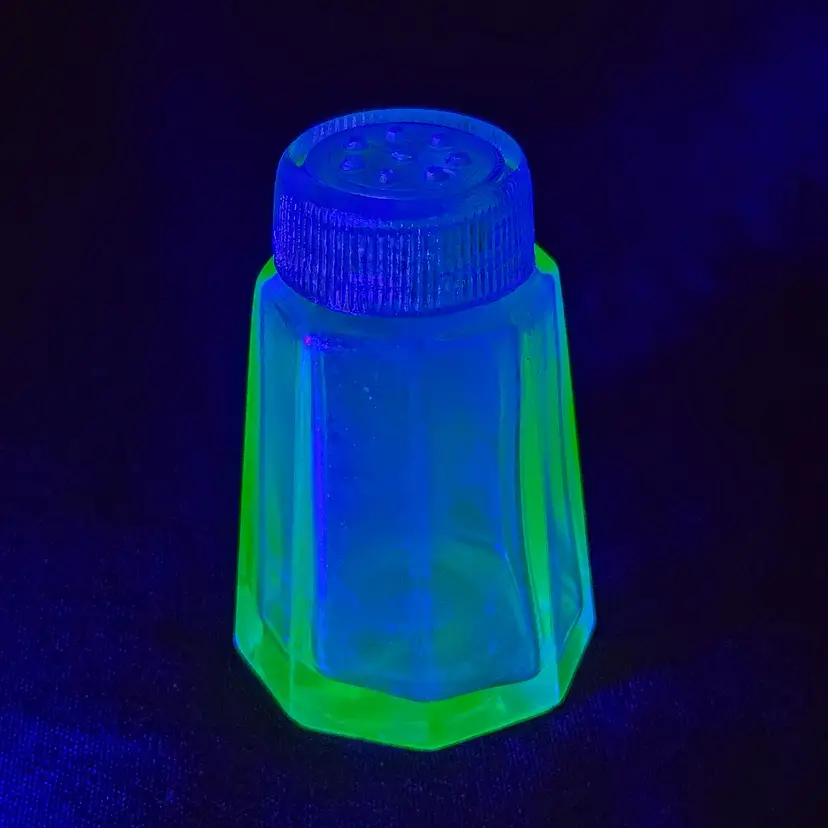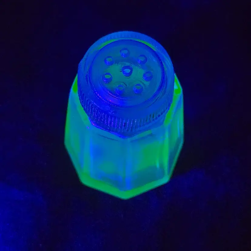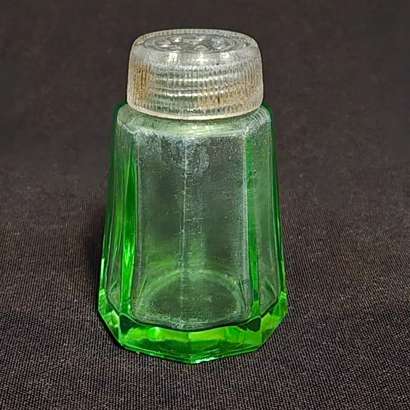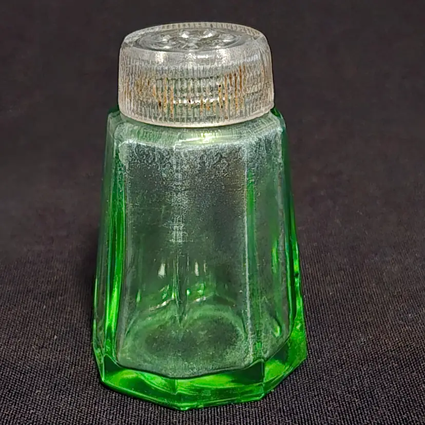Pepper Shaker Uranium Green Depression Glass with Glass Top 2¼" tall Vintage. Used condition with fleabites on top edge of shaker, stains, dirt on inside. Please view all the photos and please ask any questions prior to purchase when possible.
