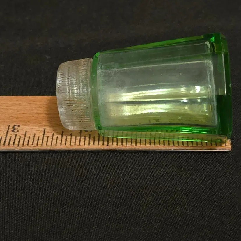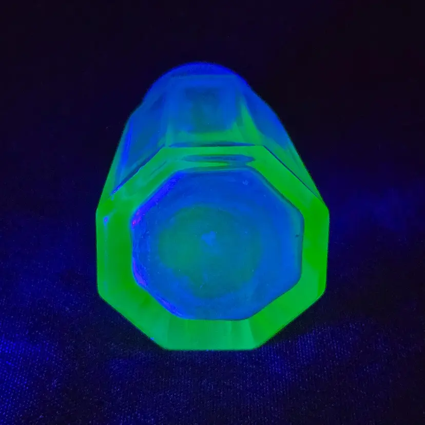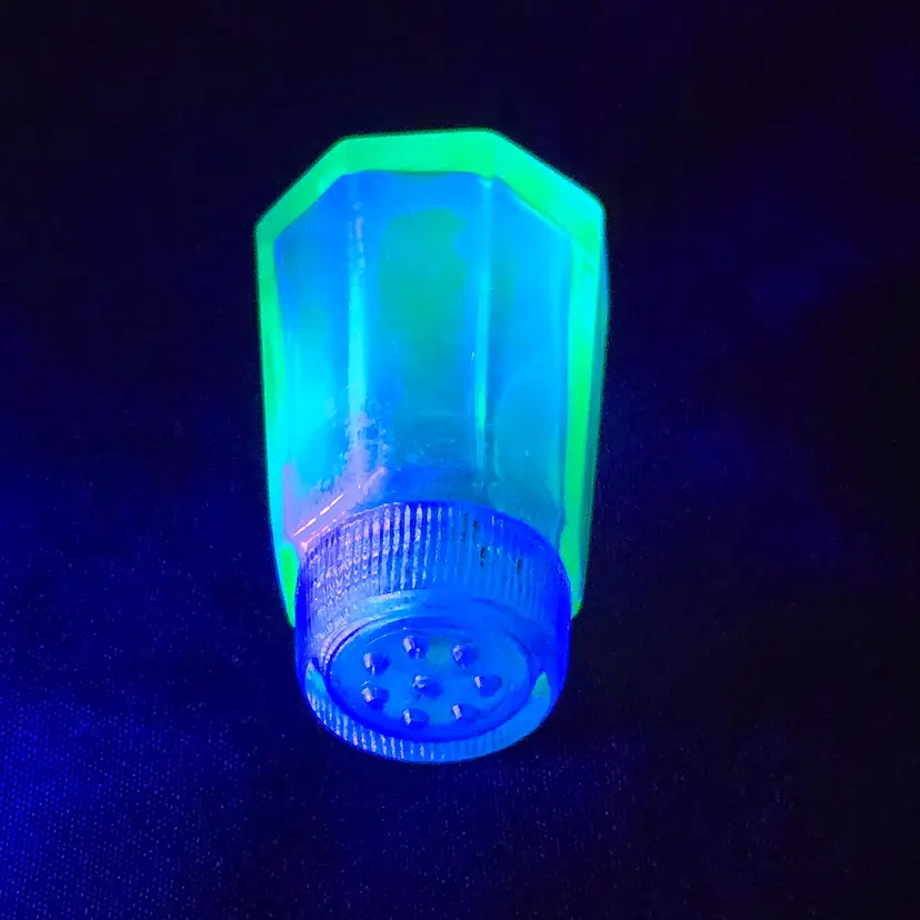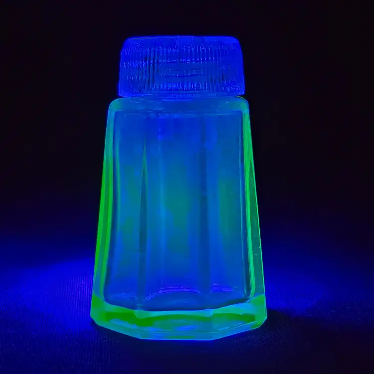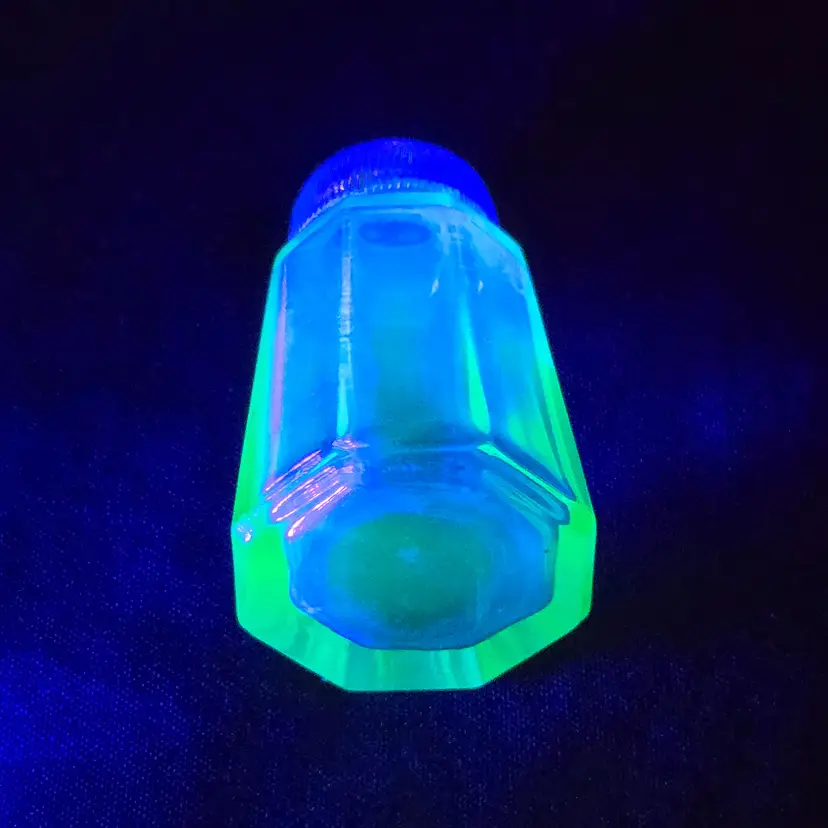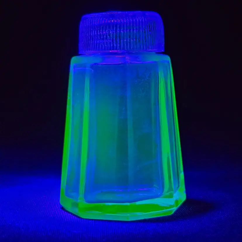Pepper Shaker Uranium Green Depression Glass with Glass Top 2¼" tall Vintage. Used condition with fleabites on top edge of shaker, stains, dirt on inside. Please view all the photos and please ask any questions prior to purchase when possible.