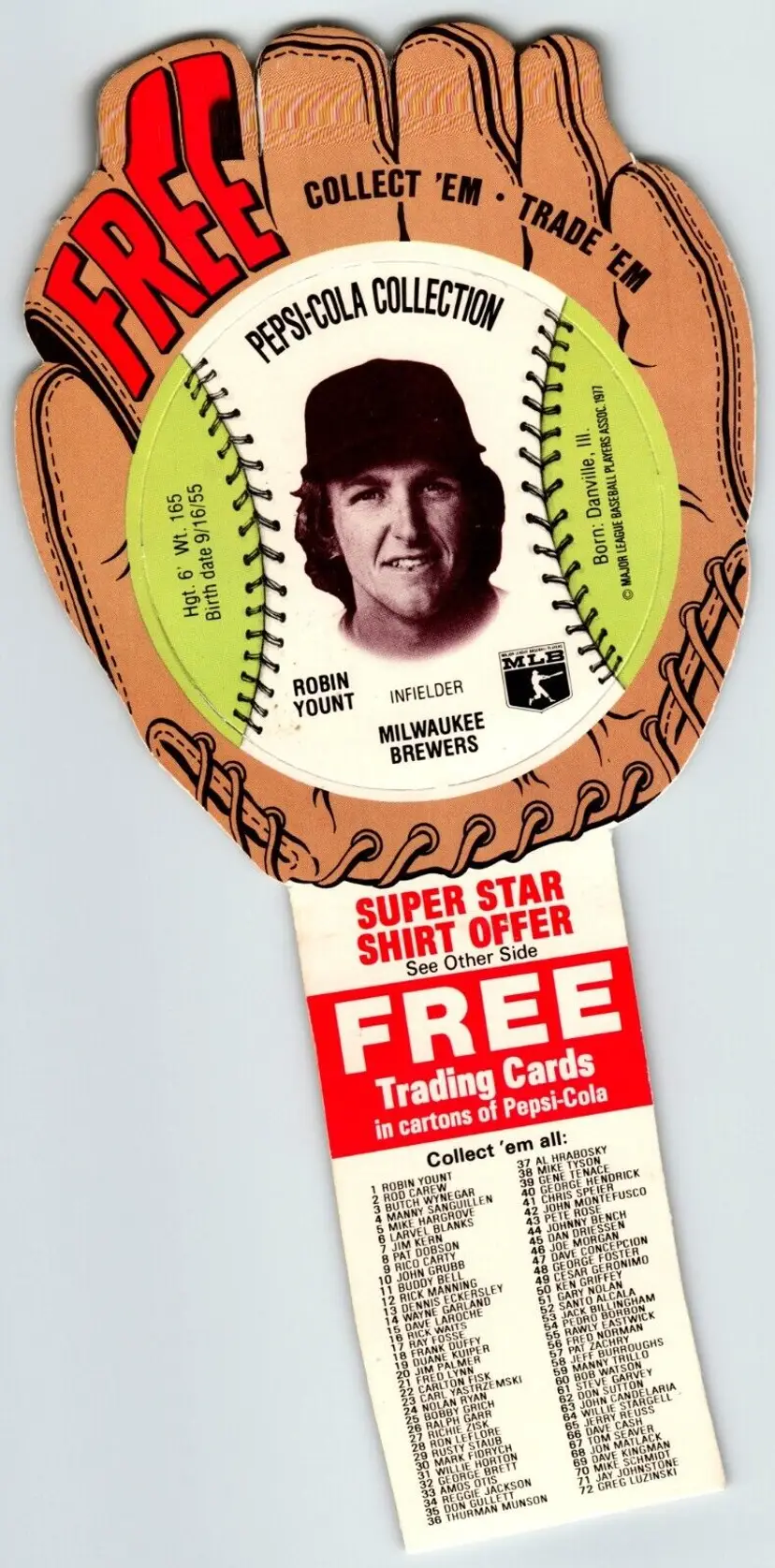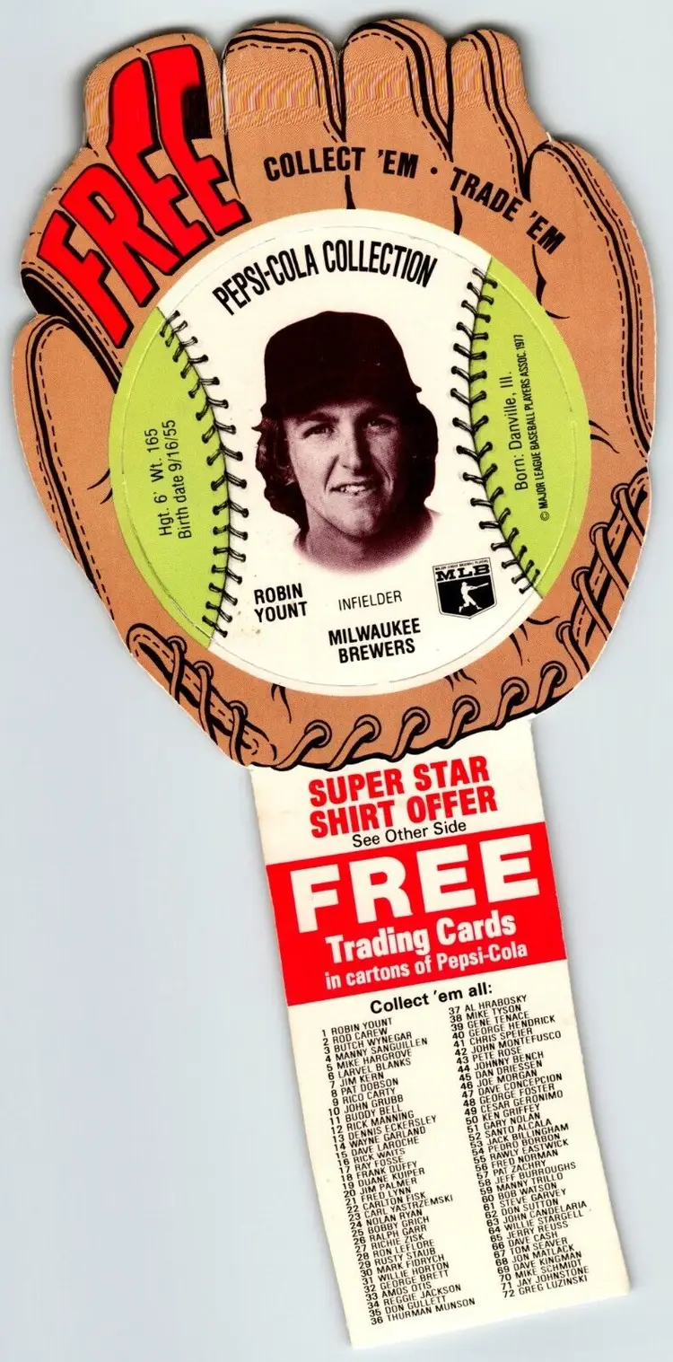 Season: 1977 Vintage: Yes Year Manufactured: 1977 Sport: Baseball Team: Milwaukee Brewers Manufacturer: Pepsi Player/Athlete: Robin Yount Autographed: No Original/Licensed Reprint: Original Parallel/Variety: Die-Cut Type: Sports Trading Card