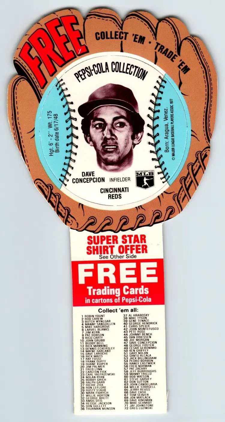 Features: 1st Edition Set: Baseball Stars Season: 1977 Vintage: Yes Country/Region of Manufacture: United States Material: Card Stock Year Manufactured: 1977 Sport: Baseball Card Size: Oversized Team: Cincinnati Reds Manufacturer: Pepsi Player/Athlete: Dave Concepcion Autographed: No Original/Licensed Reprint: Original Parallel/Variety: Die-Cut League: Major League (MLB) Type: Sports Trading Card