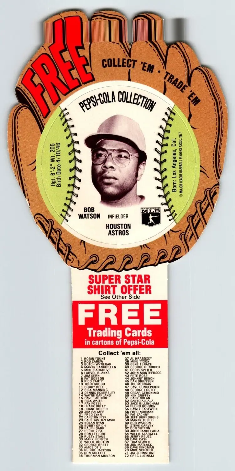 Features: 1st Edition Set: Baseball Stars Season: 1977 Vintage: Yes Country/Region of Manufacture: United States Material: Card Stock Year Manufactured: 1977 Sport: Baseball Card Size: Oversized Team: Houston Astros Manufacturer: Pepsi Player/Athlete: Bob Watson Autographed: No Original/Licensed Reprint: Original Parallel/Variety: Die-Cut League: Major League (MLB) Type: Sports Trading Card
