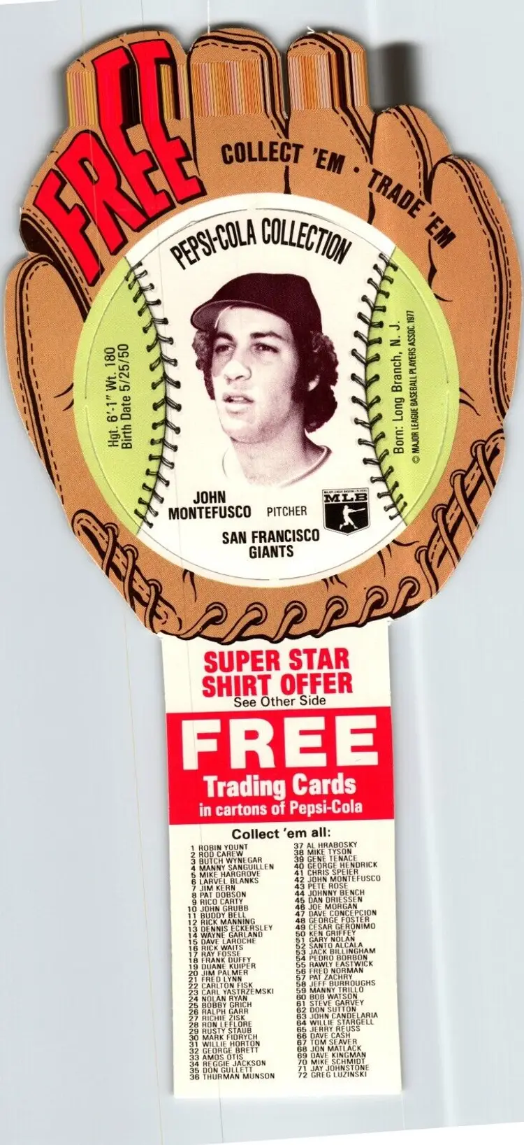 Features: 1st Edition Set: Baseball Stars Season: 1977 Vintage: Yes Country/Region of Manufacture: United States Material: Card Stock Year Manufactured: 1977 Sport: Baseball Card Size: Oversized Team: San Francisco Giants Manufacturer: Pepsi Player/Athlete: John Montefusco Autographed: No Original/Licensed Reprint: Original Parallel/Variety: Die-Cut League: Major League (MLB) Type: Sports Trading Card