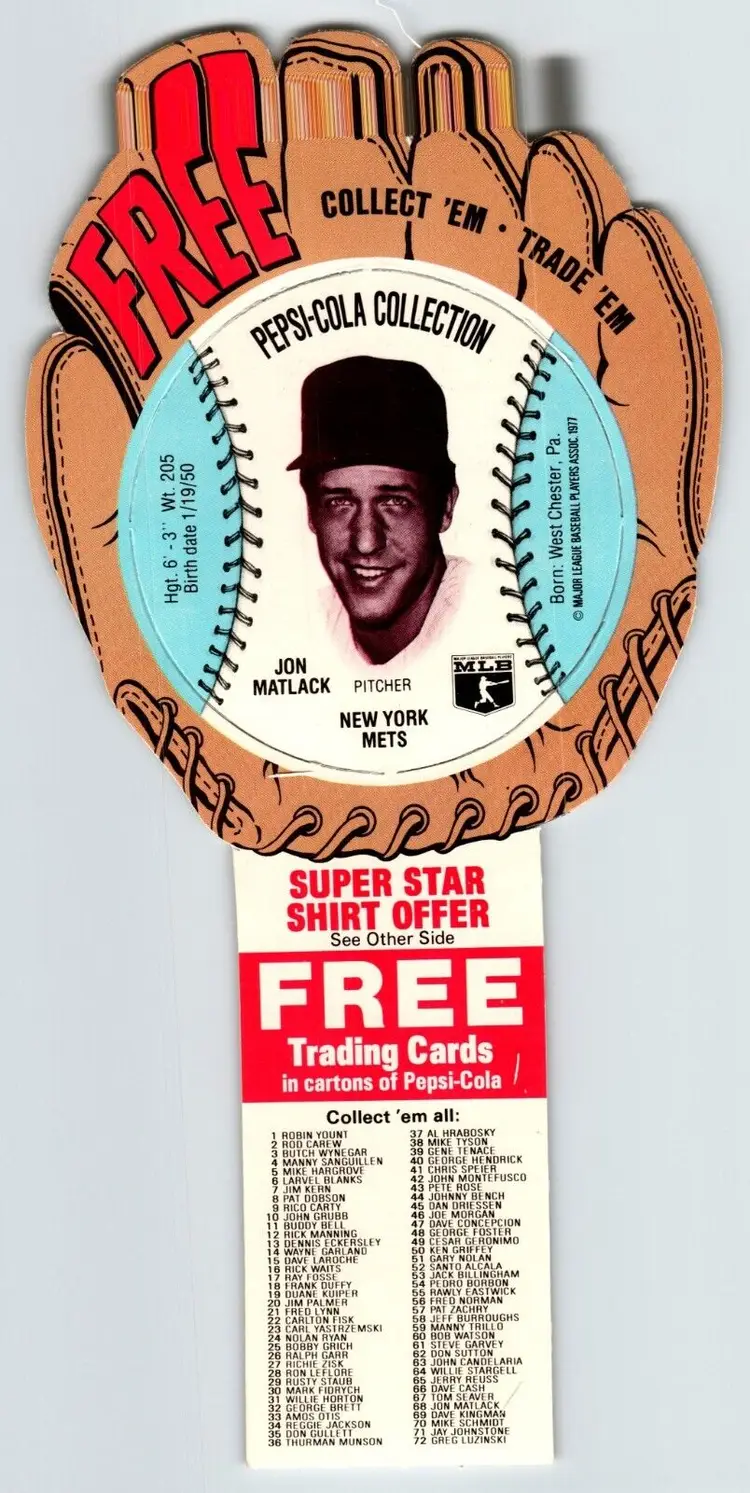 Features: 1st Edition Set: Baseball Stars Season: 1977 Vintage: Yes Country/Region of Manufacture: United States Material: Card Stock Year Manufactured: 1977 Sport: Baseball Card Size: Oversized Team: New York Mets Manufacturer: Pepsi Player/Athlete: Jon Matlack Autographed: No Original/Licensed Reprint: Original Parallel/Variety: Die-Cut League: Major League (MLB) Type: Sports Trading Card