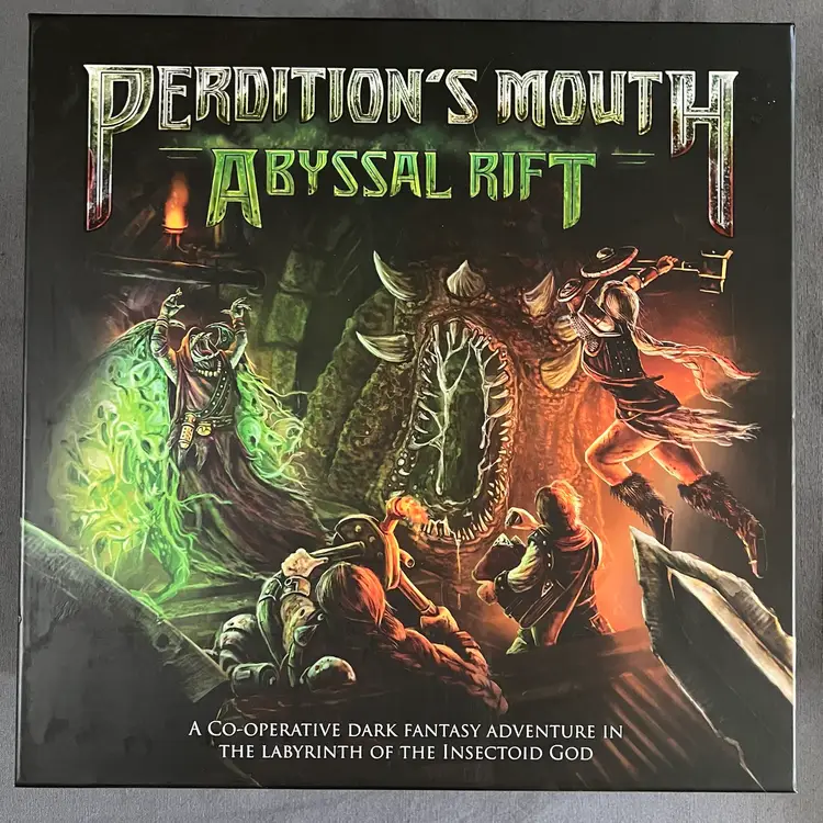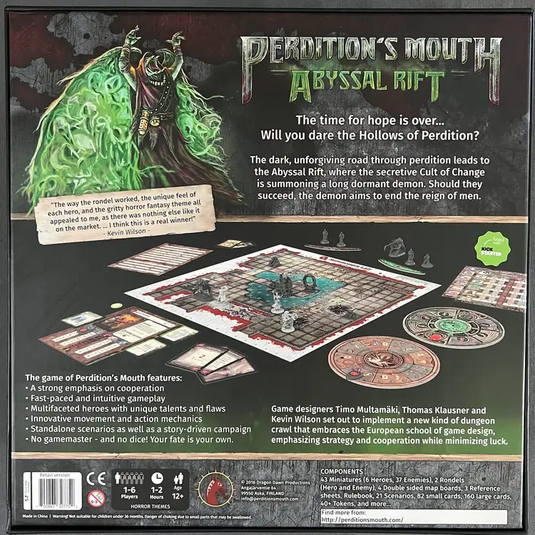 Perdition's Mouth: Abyssal Rift is a new kind of dungeon crawl, one that embraces the European school of game design with clever and elegant mechanisms and emphasizes strategy while minimizing luck. Cooperation, planning, and the enemy response deck eliminate the need for chucking dice, creating a tense combat environment with meaningful decisions! The rondels provide another tactical layer, including the enemy's devious and challenging AI. The rules allow you to learn to play in 15 minutes, with a typical game round lasting less than ten minutes, even with up to six players, but deep, strategic cooperation will be required for your band of heroes to make it through to the Abyssal Rift and maybe even come out alive.