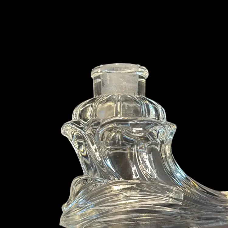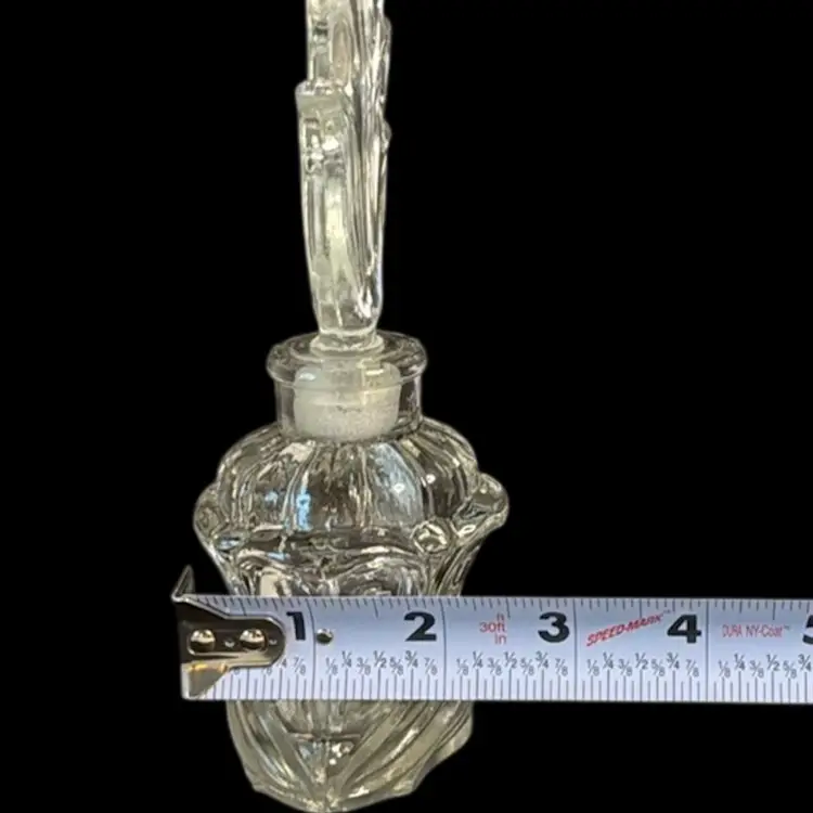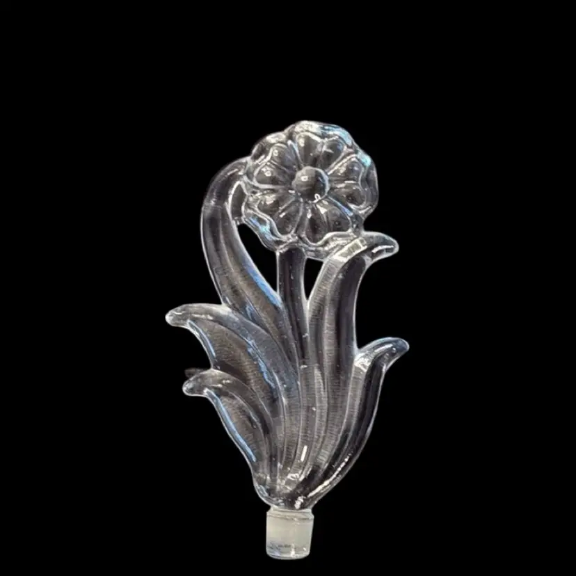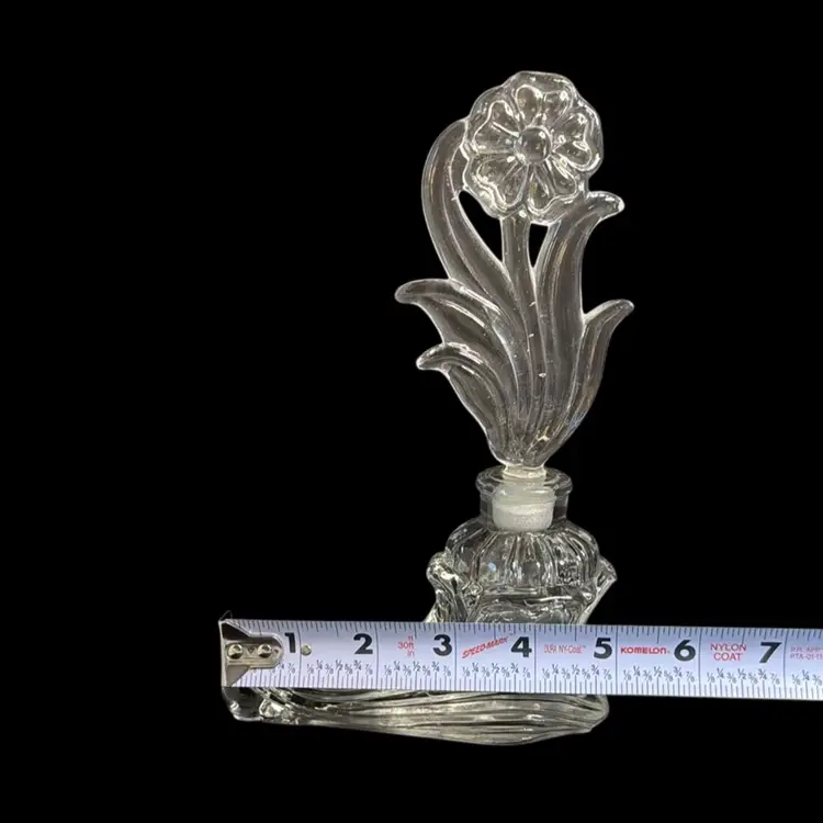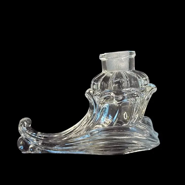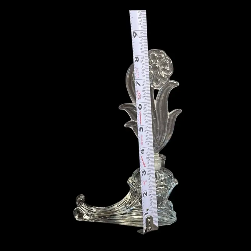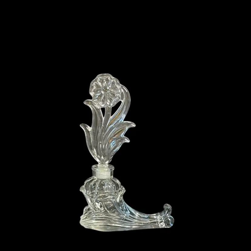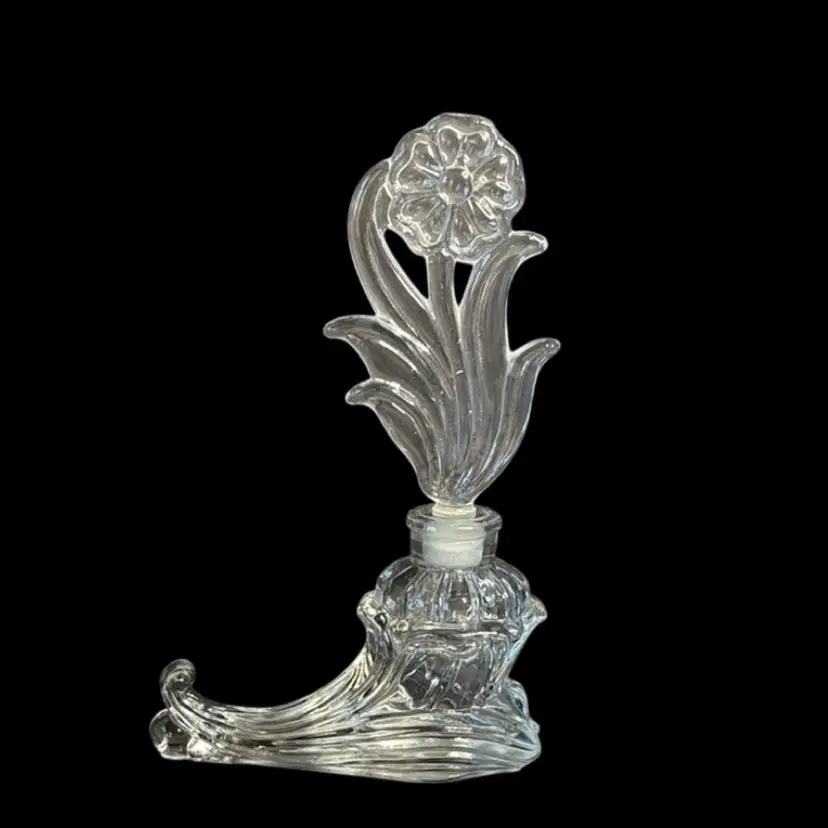 Pressed glass cornucopia perfume bottle with flower stopper.